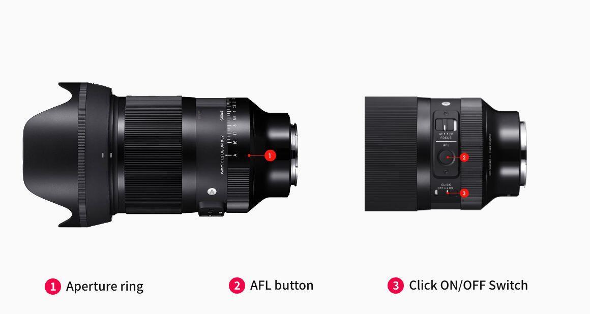 The 1 aperture ring is also mounted with a de-click function for removing clicks by the 3 Click ON/OFF Switch, enabling seamless operations that are especially useful such as during video shooting. Furthermore, the 2 AFL button which can be assigned with various functions widens the range of operations available on the lens.