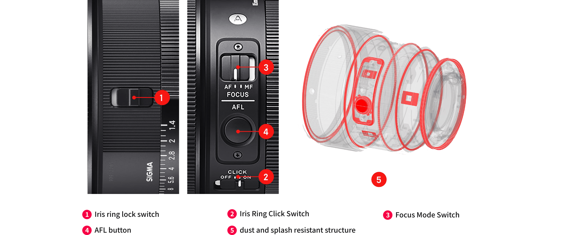 This compact lens is packed with a range of functionalities that will satisfy both professional and advanced amateur photographers. The 85mm F1.4 DG DN | Art has newly introduced an 1 “Iris ring lock switch .*1” This prevents from unintended movement of the iris ring during shooting, allowing users to devote their attention to the creation of their image. The Iris ring is mounted with a de-click function for removing clicks by the 2 Iris Ring Click Switch, enabling seamless operations that are especially useful such as during video shooting. Furthermore, the 3 “Focus Mode Switch ” on the lens body and the 4 “AFL button *2” that allows various functions to be assigned from a camera body will also assist users’ shooting.