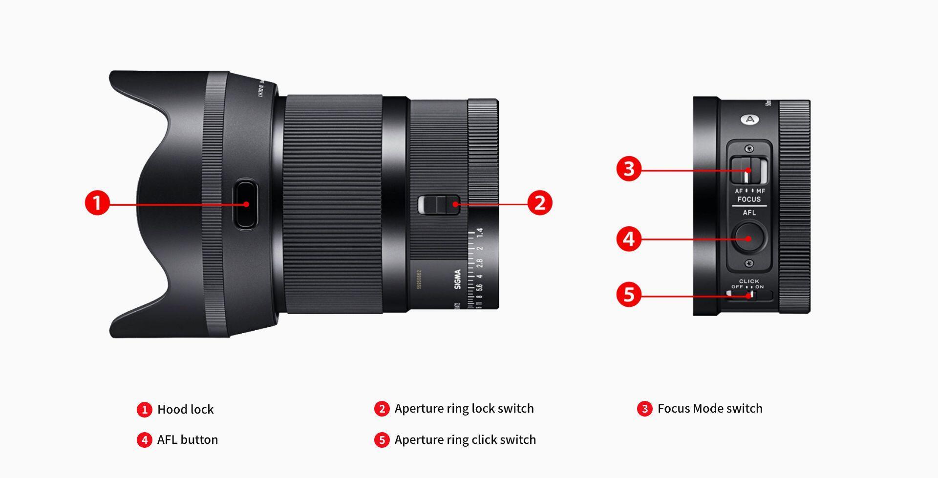 The lens barrel is equipped with a Focus Mode switch, an Aperture ring click switch to turn the click on and off, an Aperture ring lock switch to prevent unintended operation, and an AFL button to assign any function from the camera. These features are designed for intuitive operation during shooting.