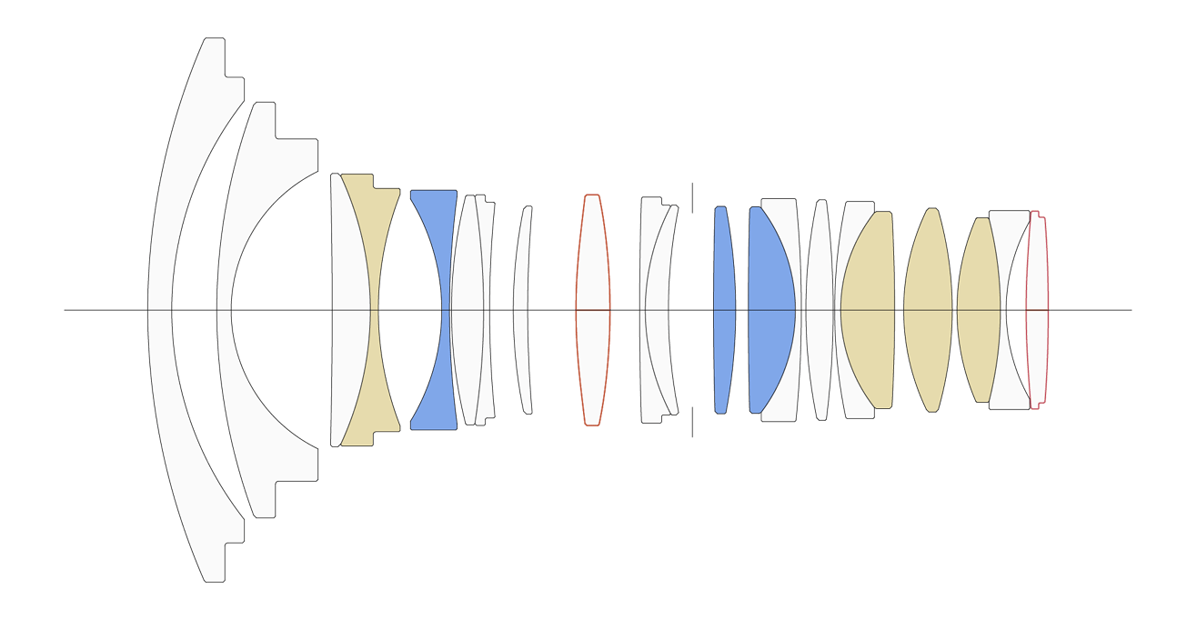 The lens consists of 21 elements in 15 groups, including 4 FLD and 3 SLD exclusive low-dispersion glass elements, and 2 aspherical lens elements. By correcting sagittal coma flare and other aberrations, the lens can precisely reproduce bright points of light across the whole frame even wide open, making it ideal for astrophotography.