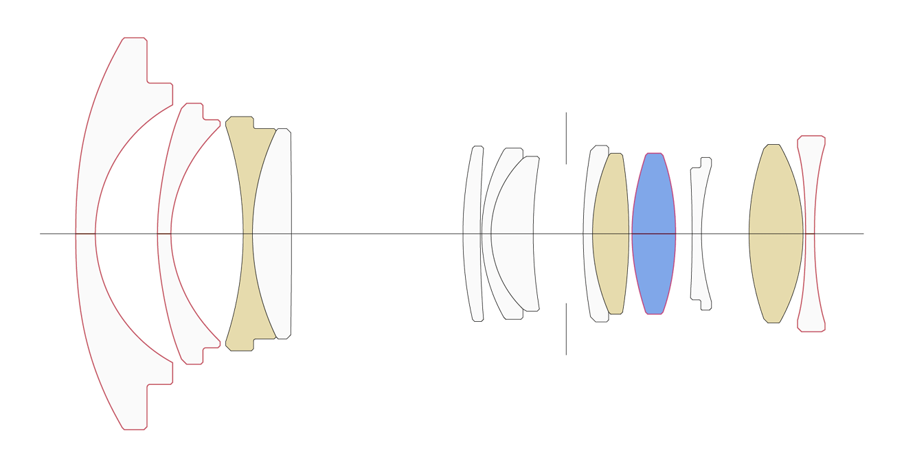 13 elements in 10 groups (3 FLD, 1 SLD, and 4 aspherical elements)