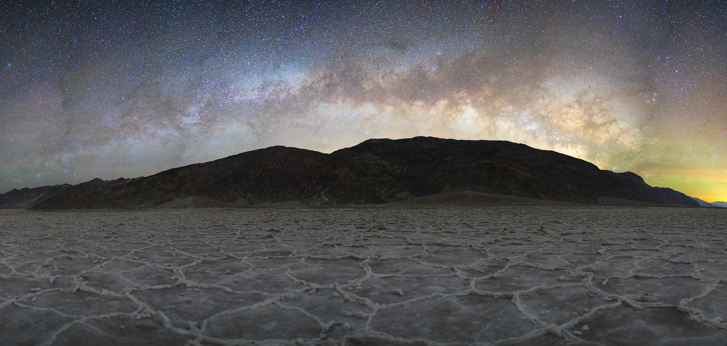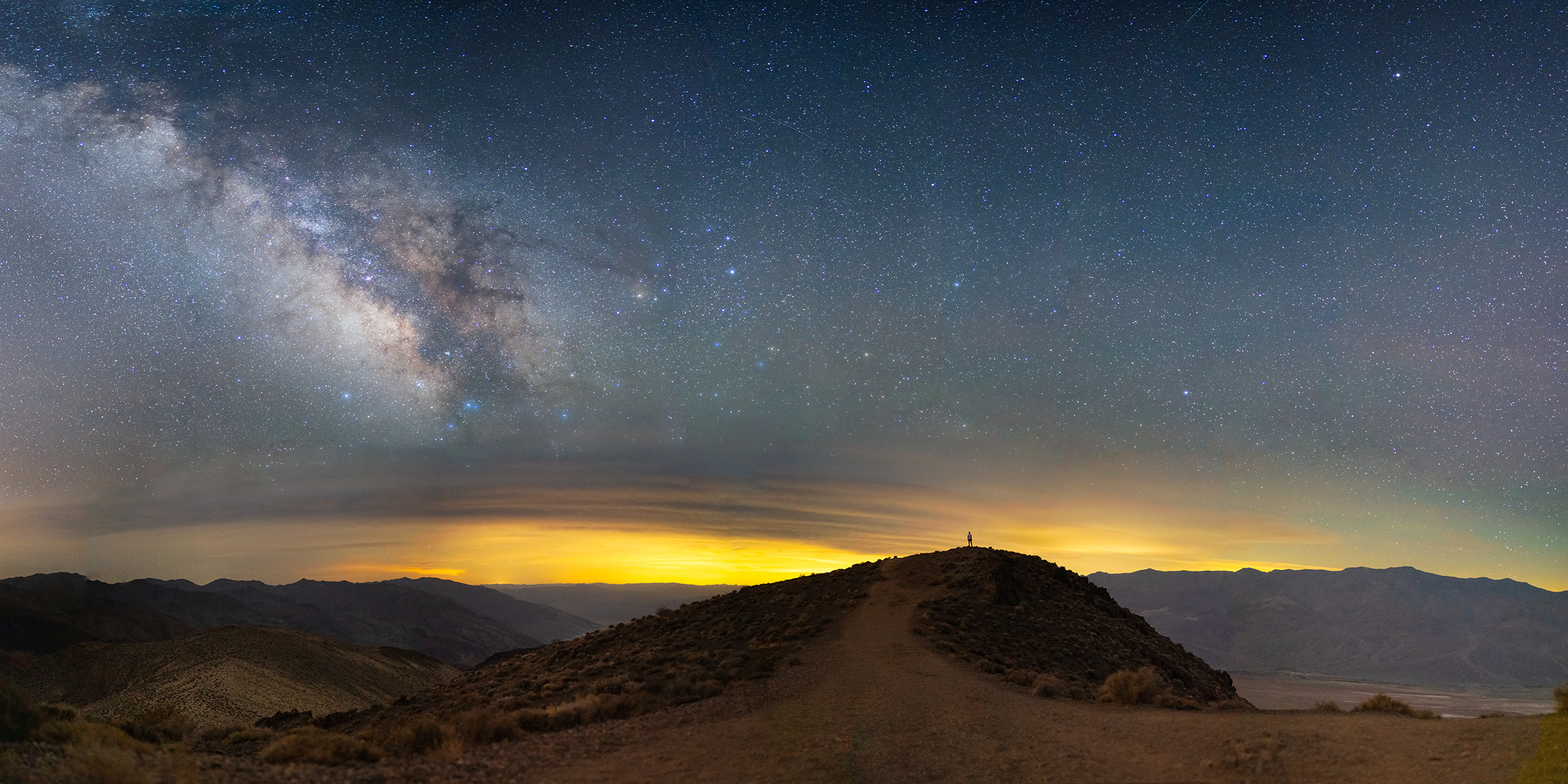 For my last stop, I planned on returning to a location I visited under Moonlight, Dante's View. At this time of the year, the Milky Way would be just off to the left side of the trail and be in the perfect location to capture in another large panoramic image. I wouldn't have much time, but thankfully I wouldn't have the strong winds to deal with this time around. Racing against the quickly approaching sunrise, I shot the sky images first followed by the foreground images. I didn't want to composite myself standing in, so I set a timer for the center foreground frame and sprinted into place.