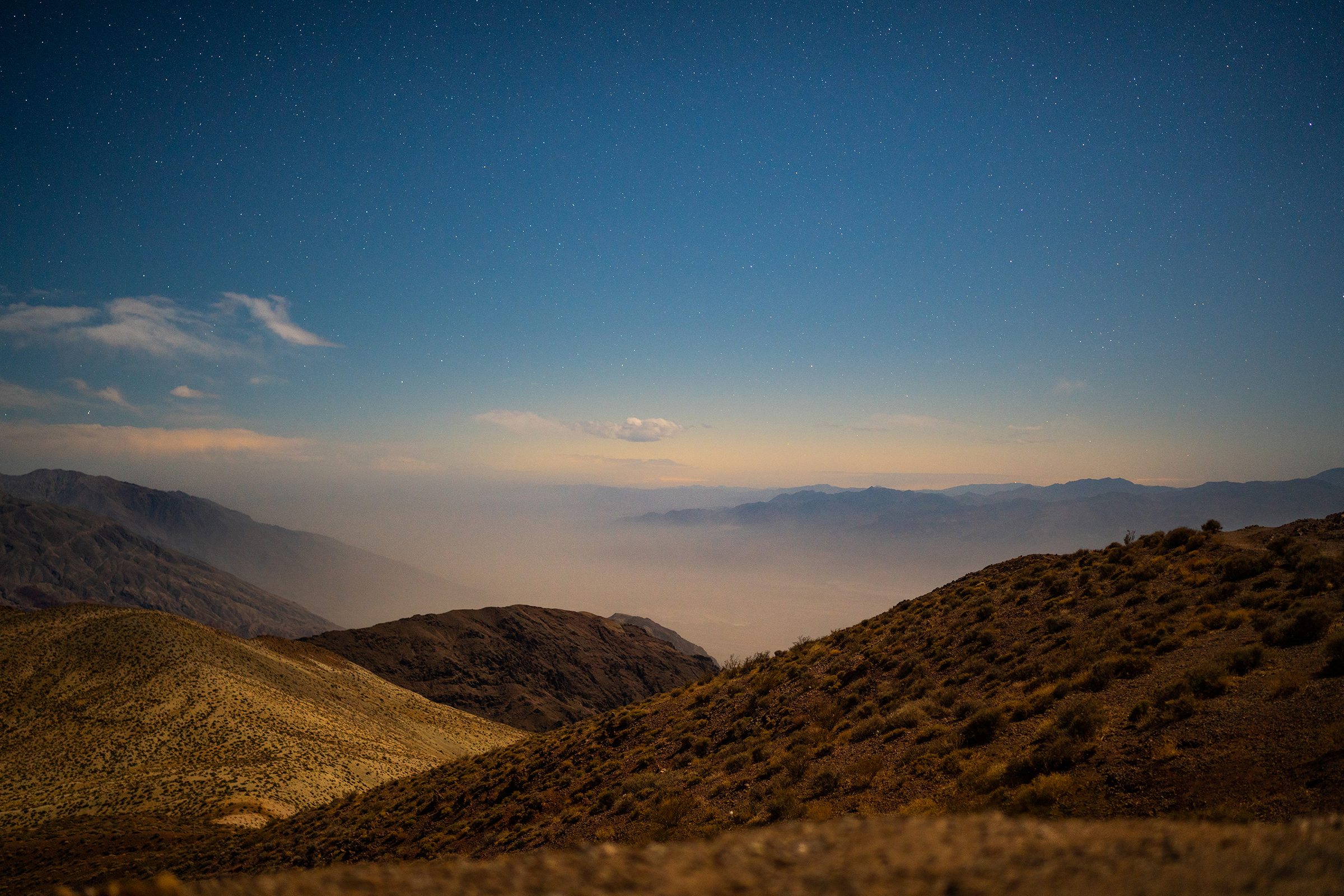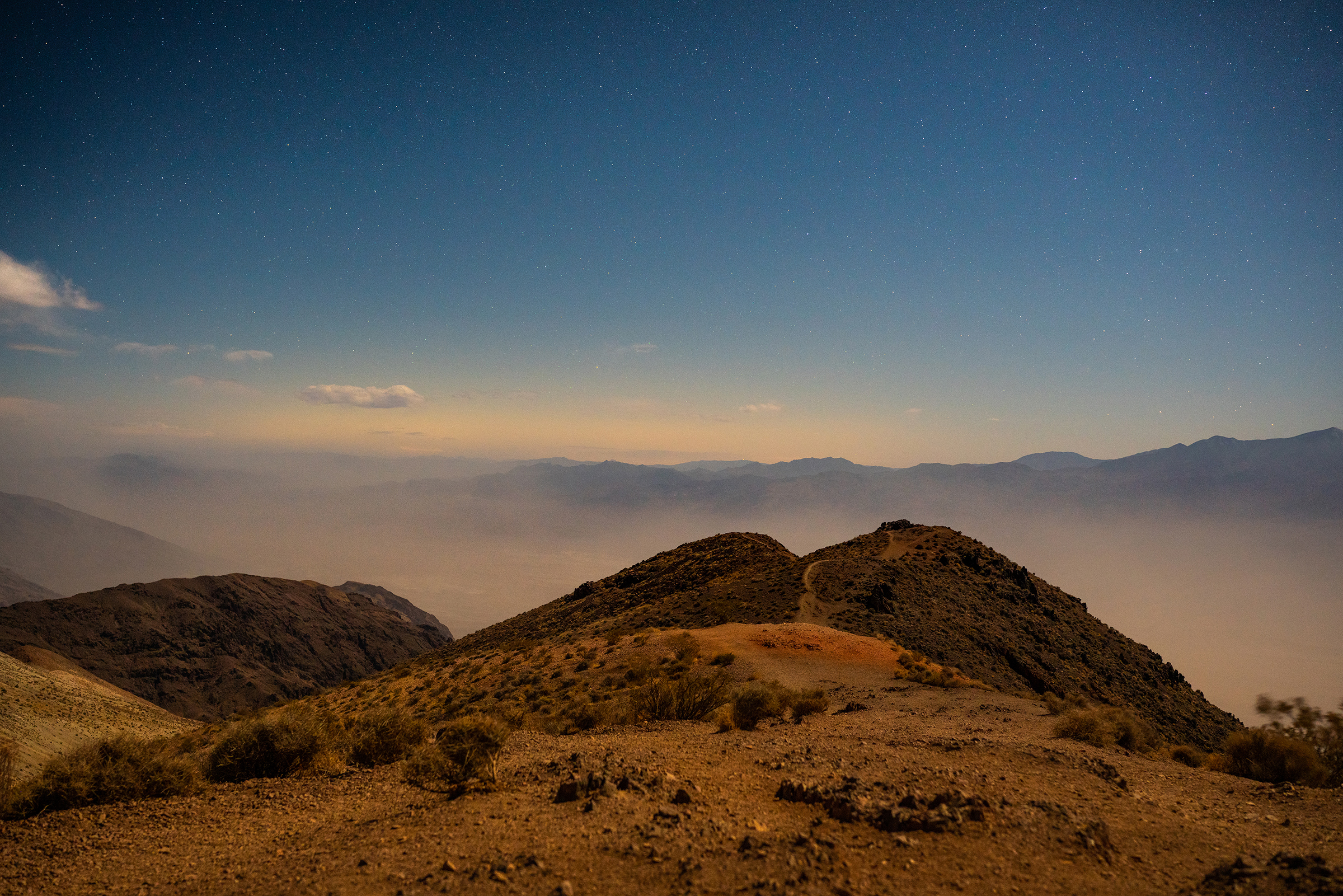 Sitting at 5,476 feet (1,669 m), my first Moonlit stop would be Dante's View. Low clouds and dust kicked up on the valley floor made for dramatic conditions below, but unfortunately for me meant that intense winds were ripping through the trail. The wind advisory was calling for things to die down a bit before I started shooting, but there were very few signs of it letting up.