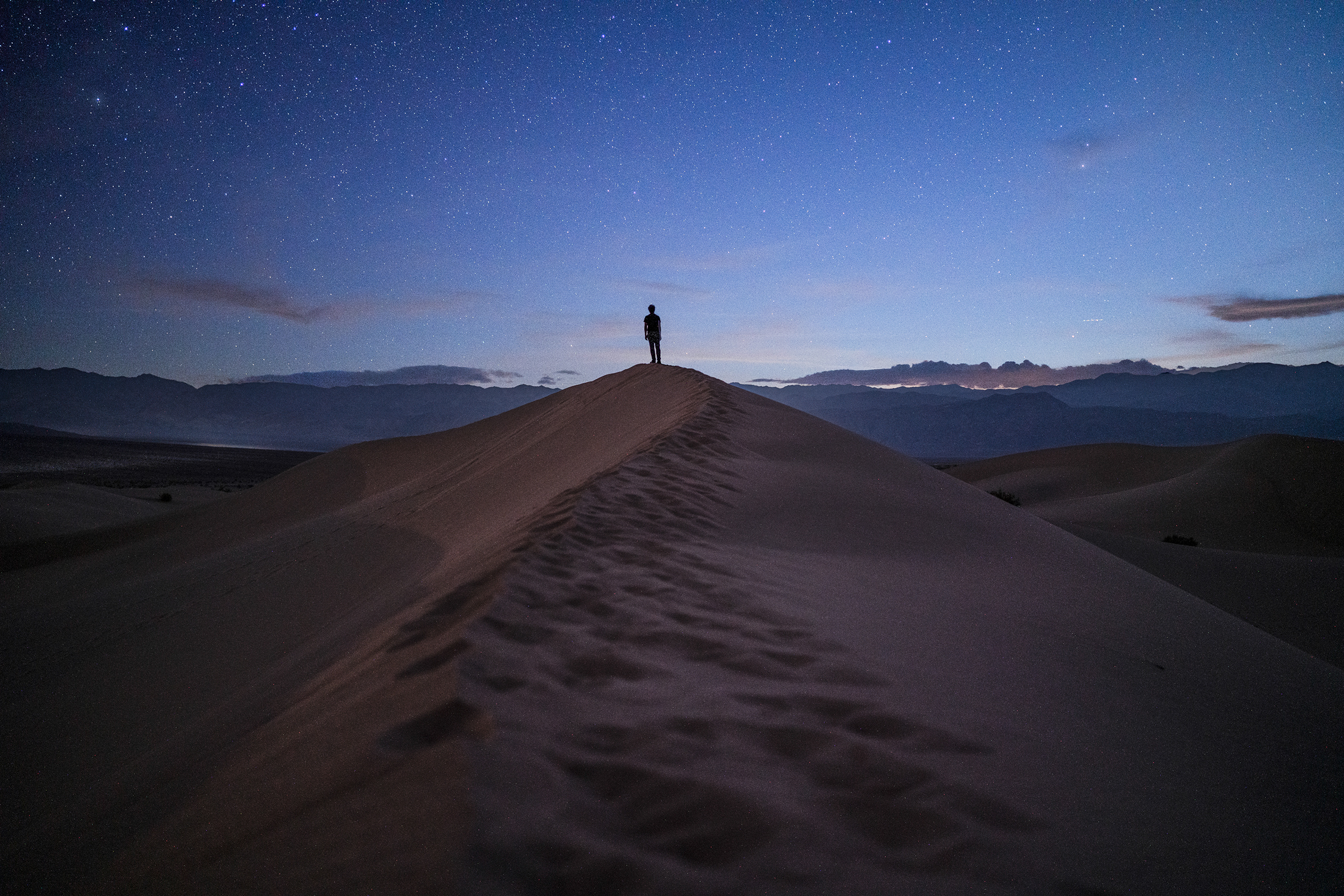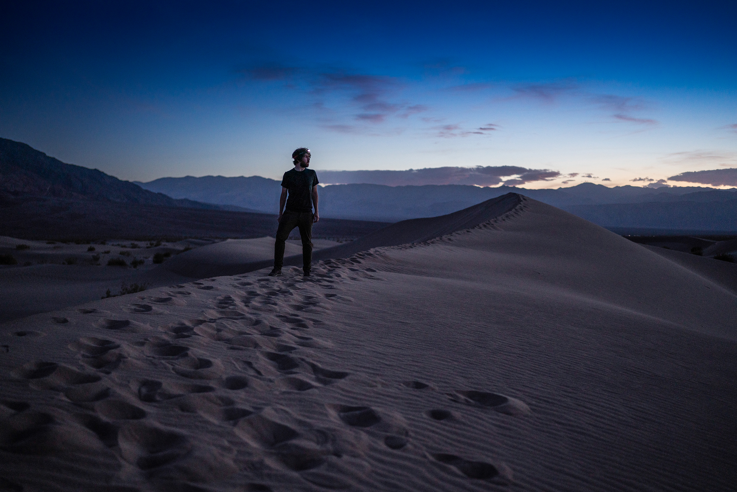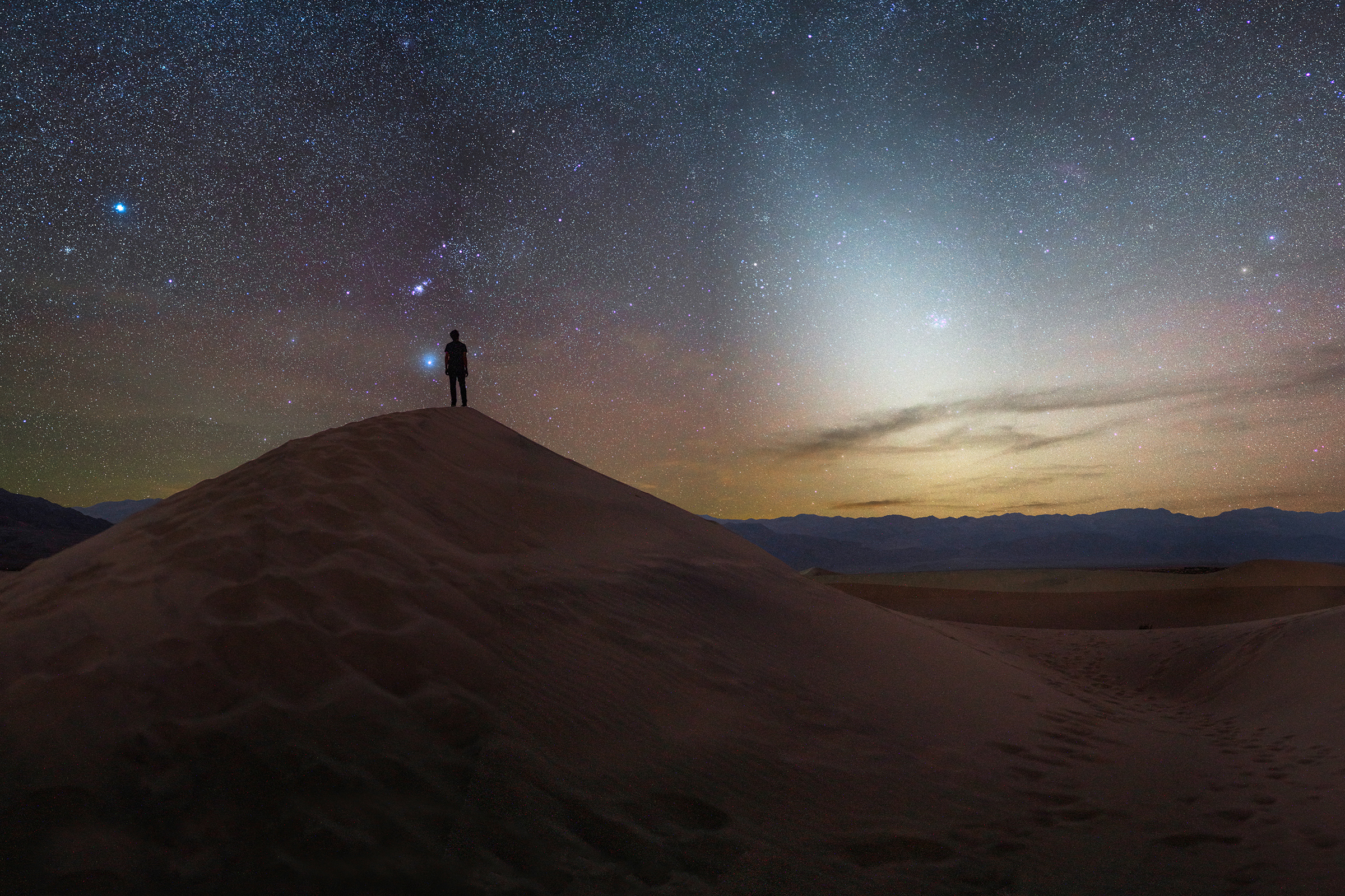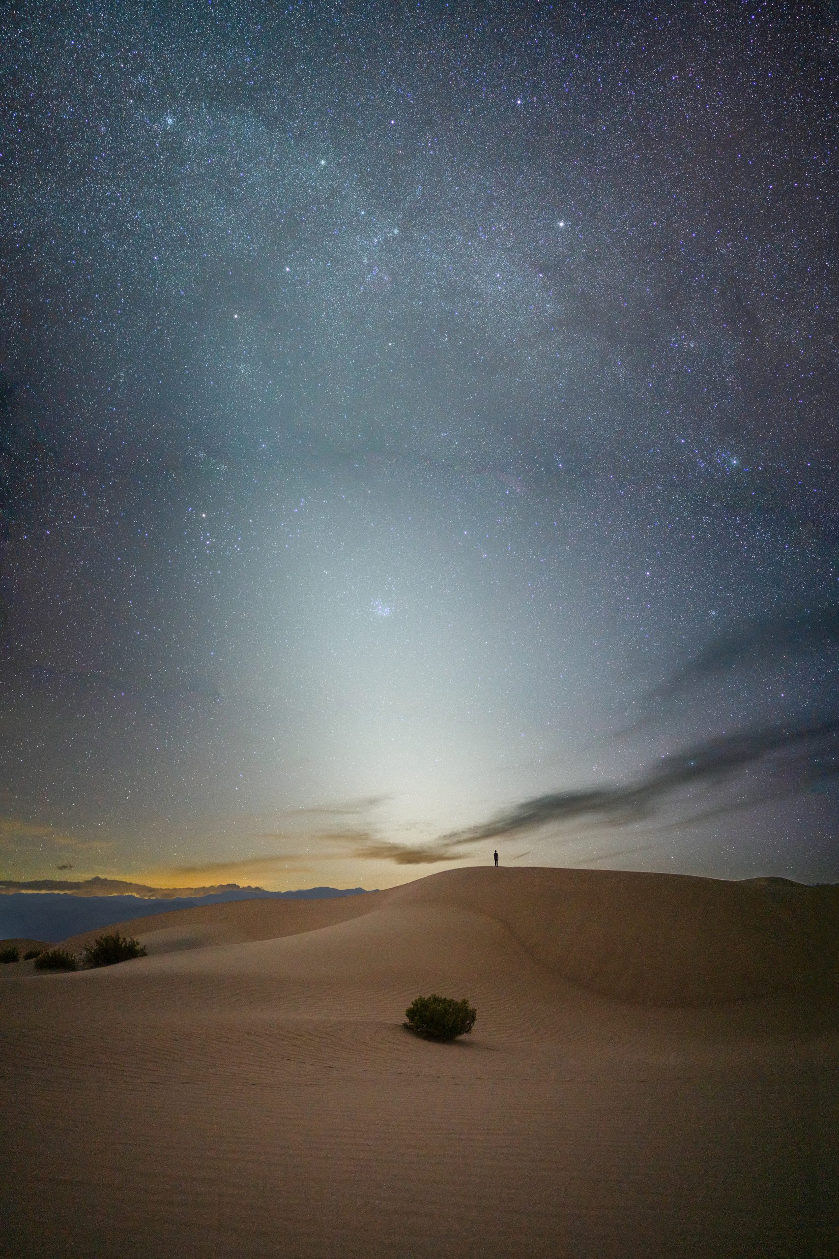 About an hour after sunset, particles of space dust are lit up by remaining sunlight creating a faint glow called the zodiacal light. I shot the first two images of the sky and then set the camera on a timer for a very tiring sprint up the distance dunes.