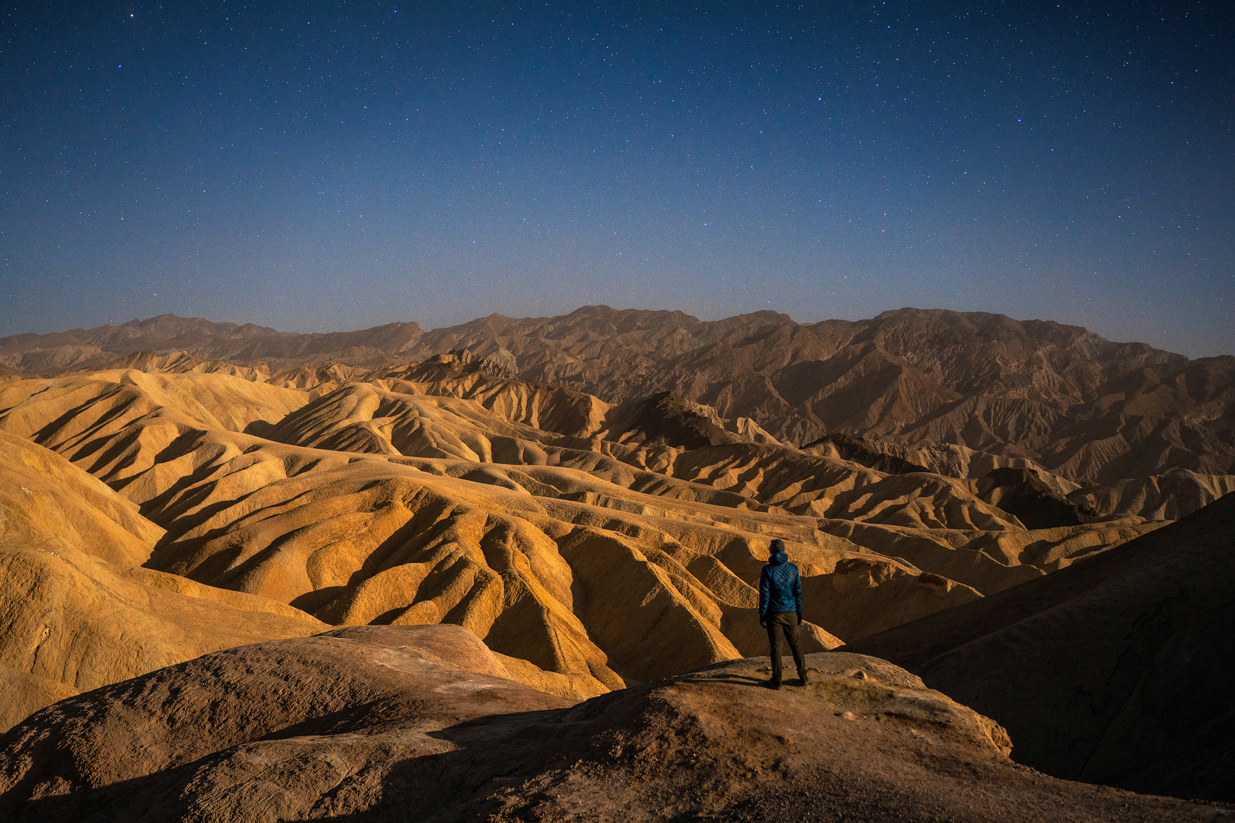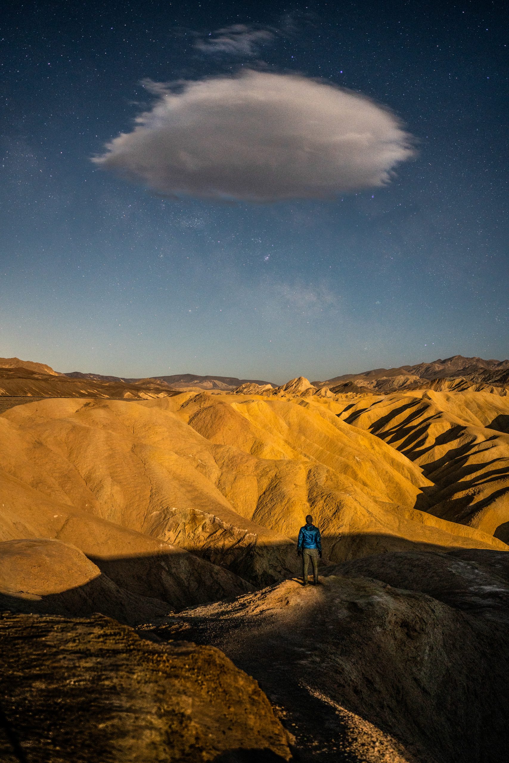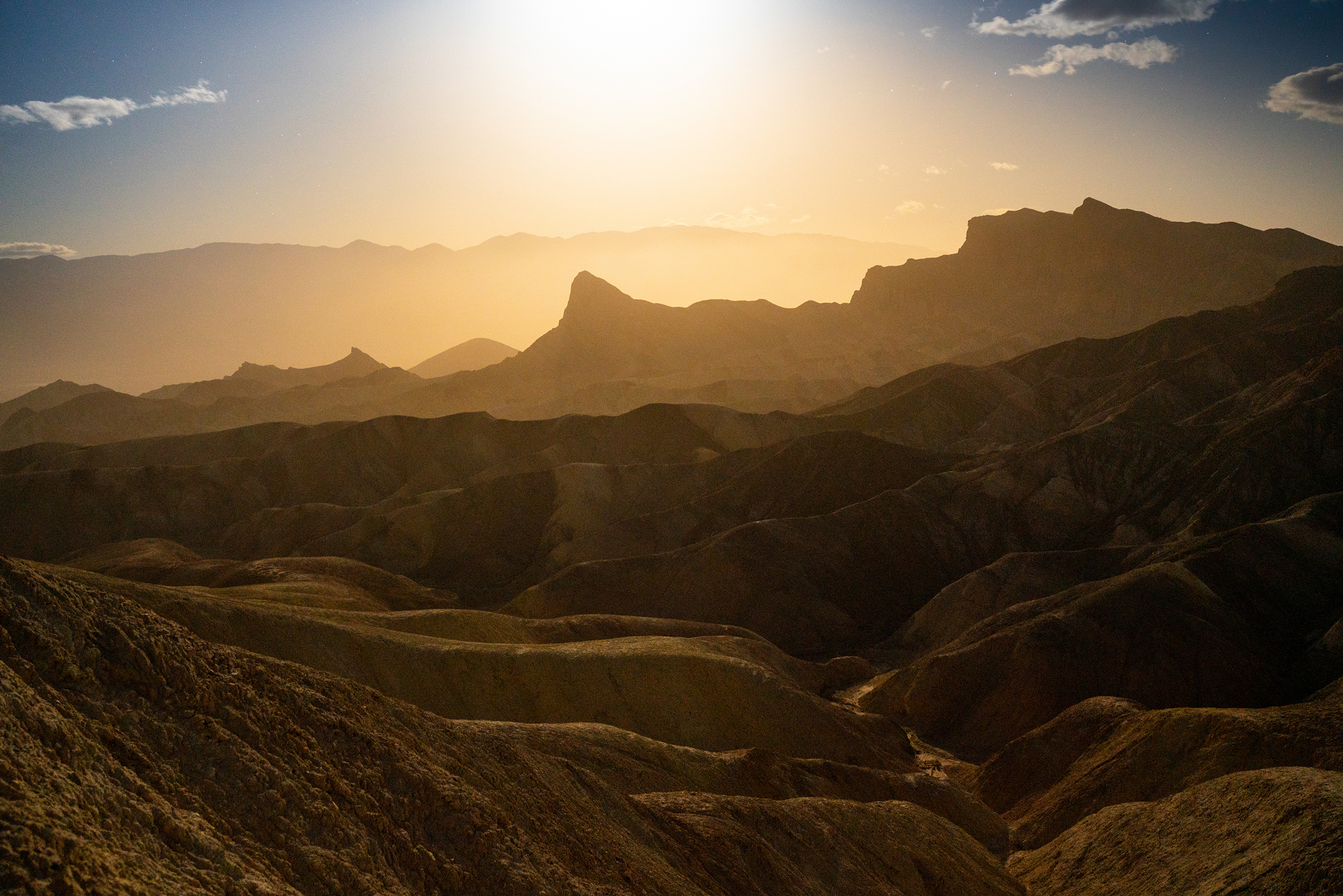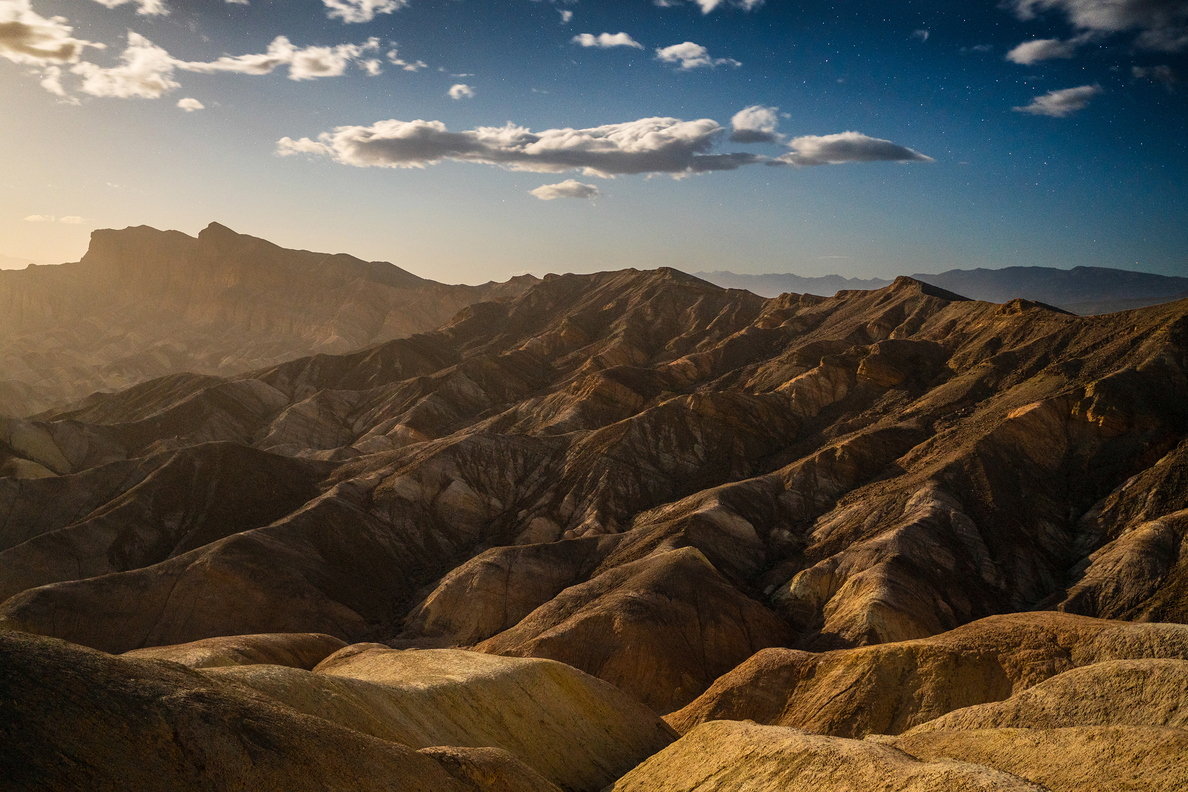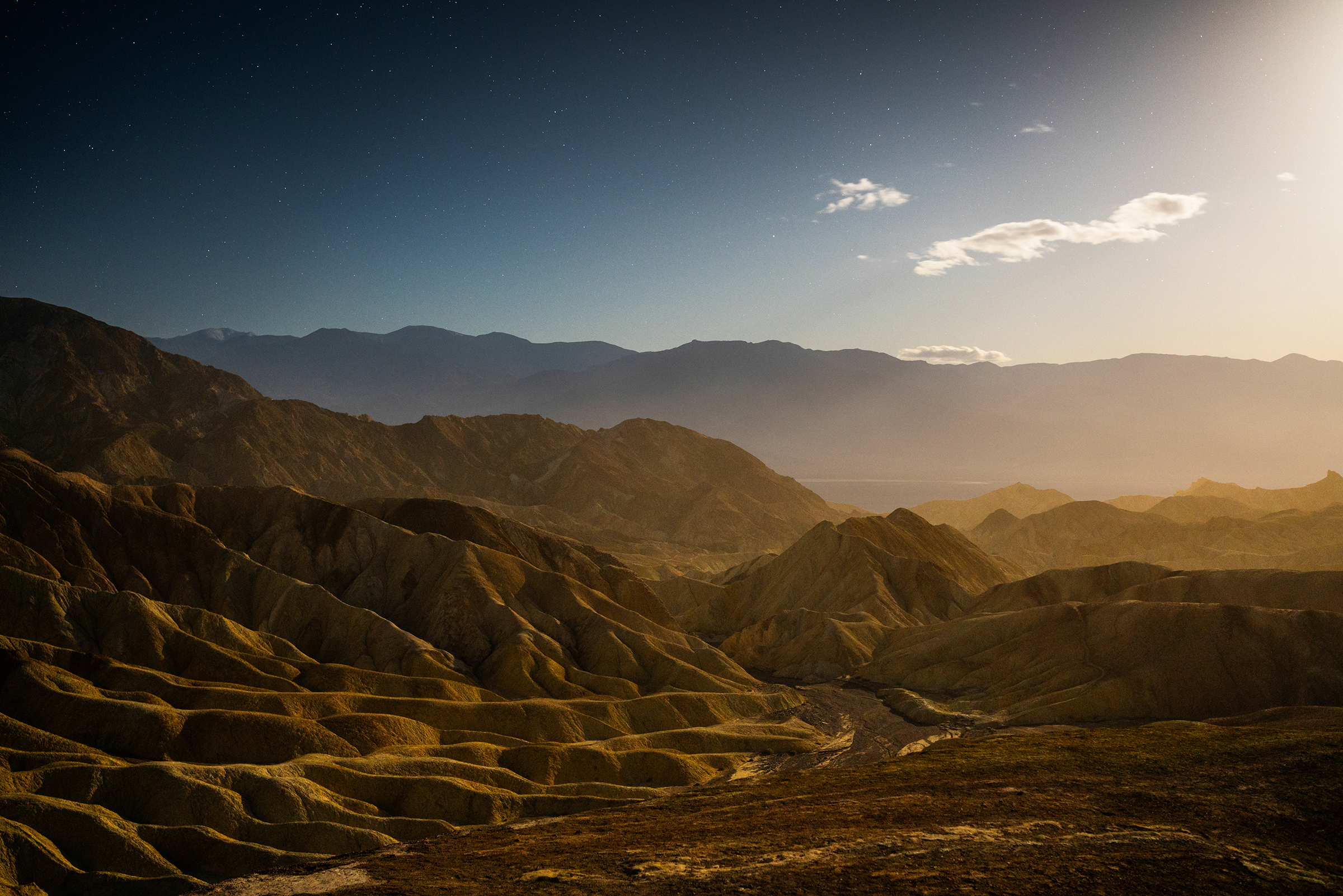 From here I would head to a hopefully less windy, but just as beautiful area of the park, Zabriskie Point. Often photographed at sunrise and sunset, I wanted to show off the incredible landscape features here using Moonlight.