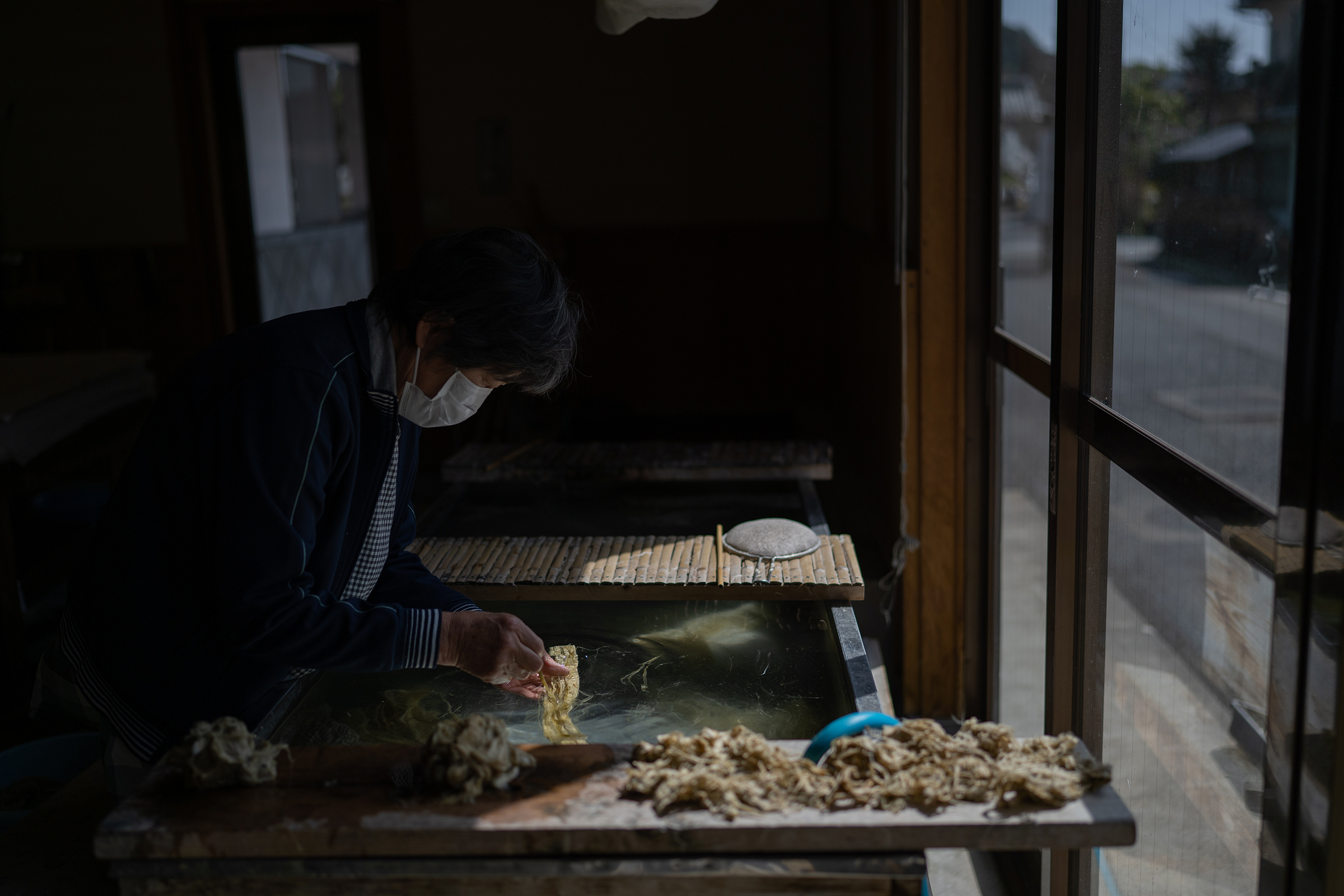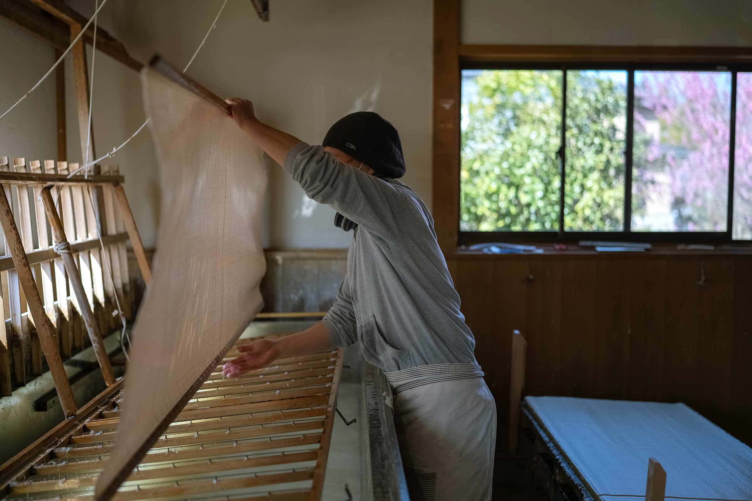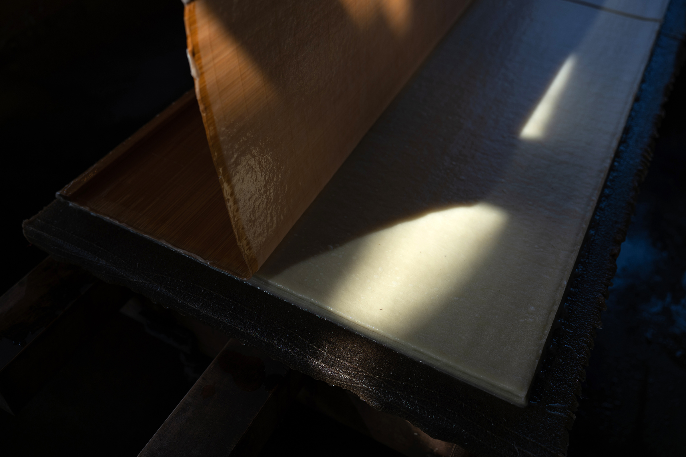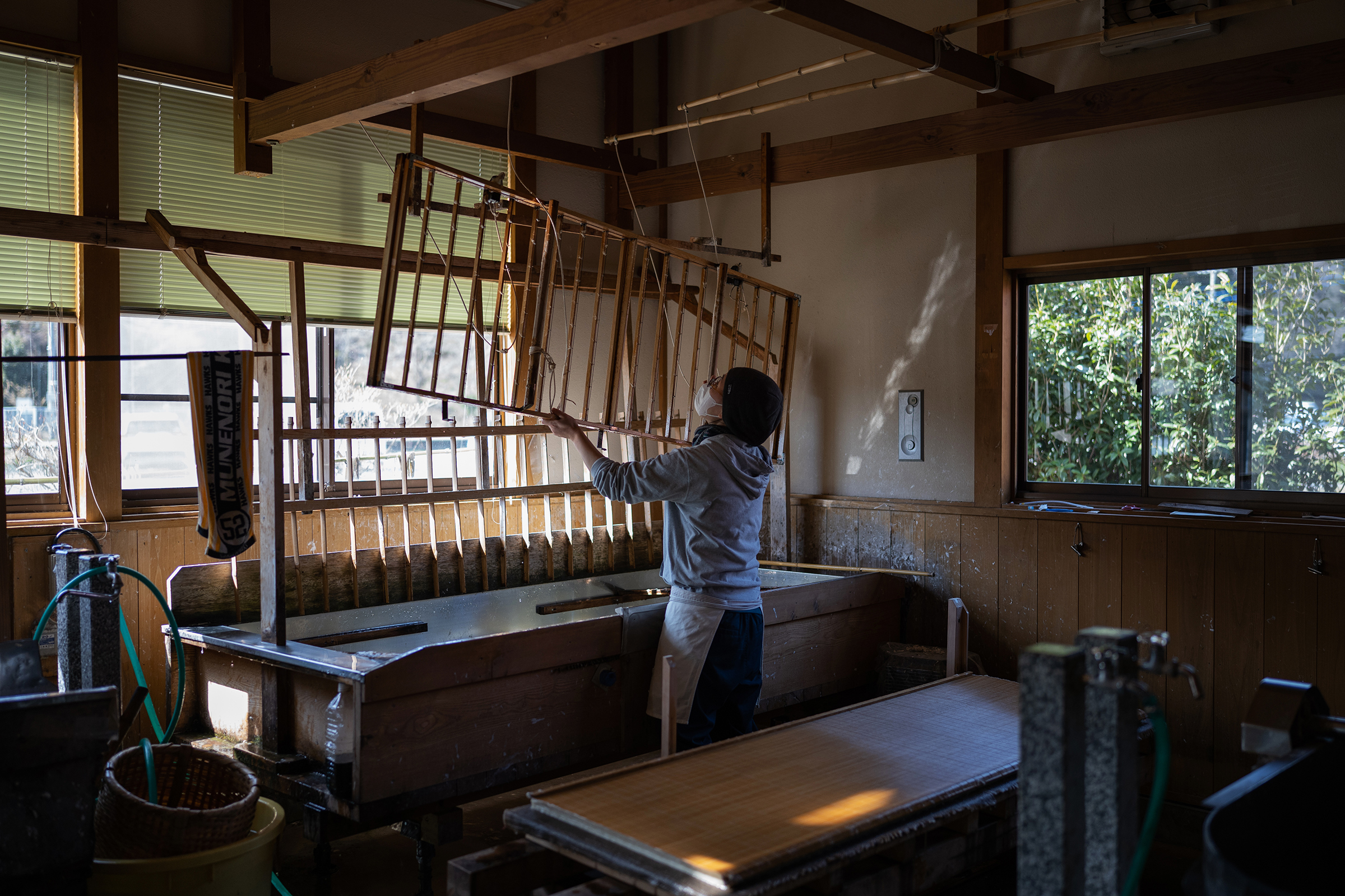 Paper and photography have been linked from the very beginning. Photography was born from the desire of people to preserve the image the camera obscura displayed. Paper is the way to fix forever what the camera saw only once. I am really grateful to have had this opportunity to document the washi making process in this small workshop. Everything there was perfect for photography. Firstly, because of the natural light used to check the paper's quality, and secondly because of the precise and repetitive movements needed in washi-making. As a photographer I have to be invisible in these situations; I'm there to document, in the most natural and candid way, how the people work and use their workplace. That's why knowing my lens and my framing is the most useful skill. I can join in the movements; I don't have to think which lens I should use, which distance to stand. I know all that so I can work at the same rhythm as the washi maker. As he is moving, I am moving, too. When I embrace this tempo, I can capture the image I want.