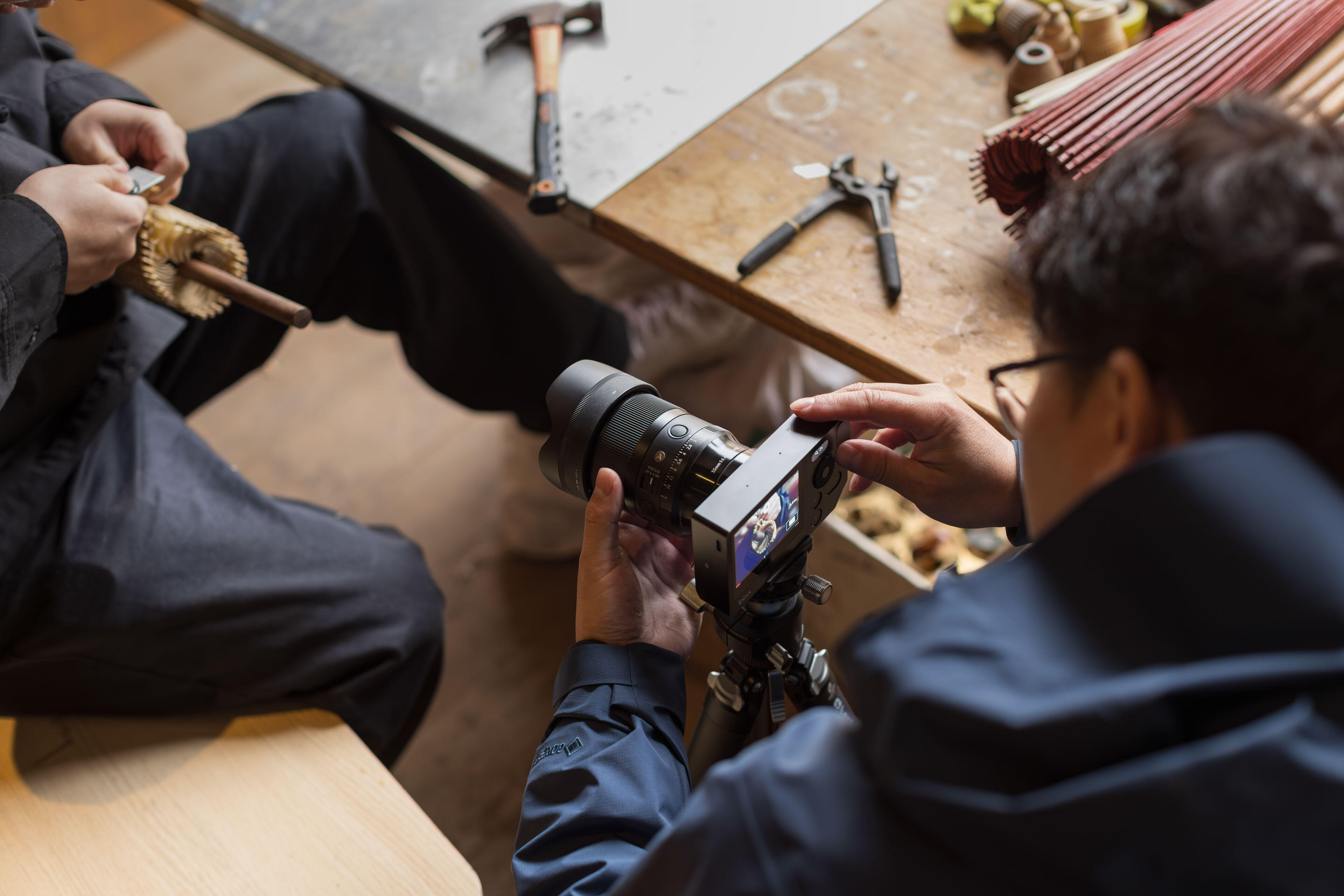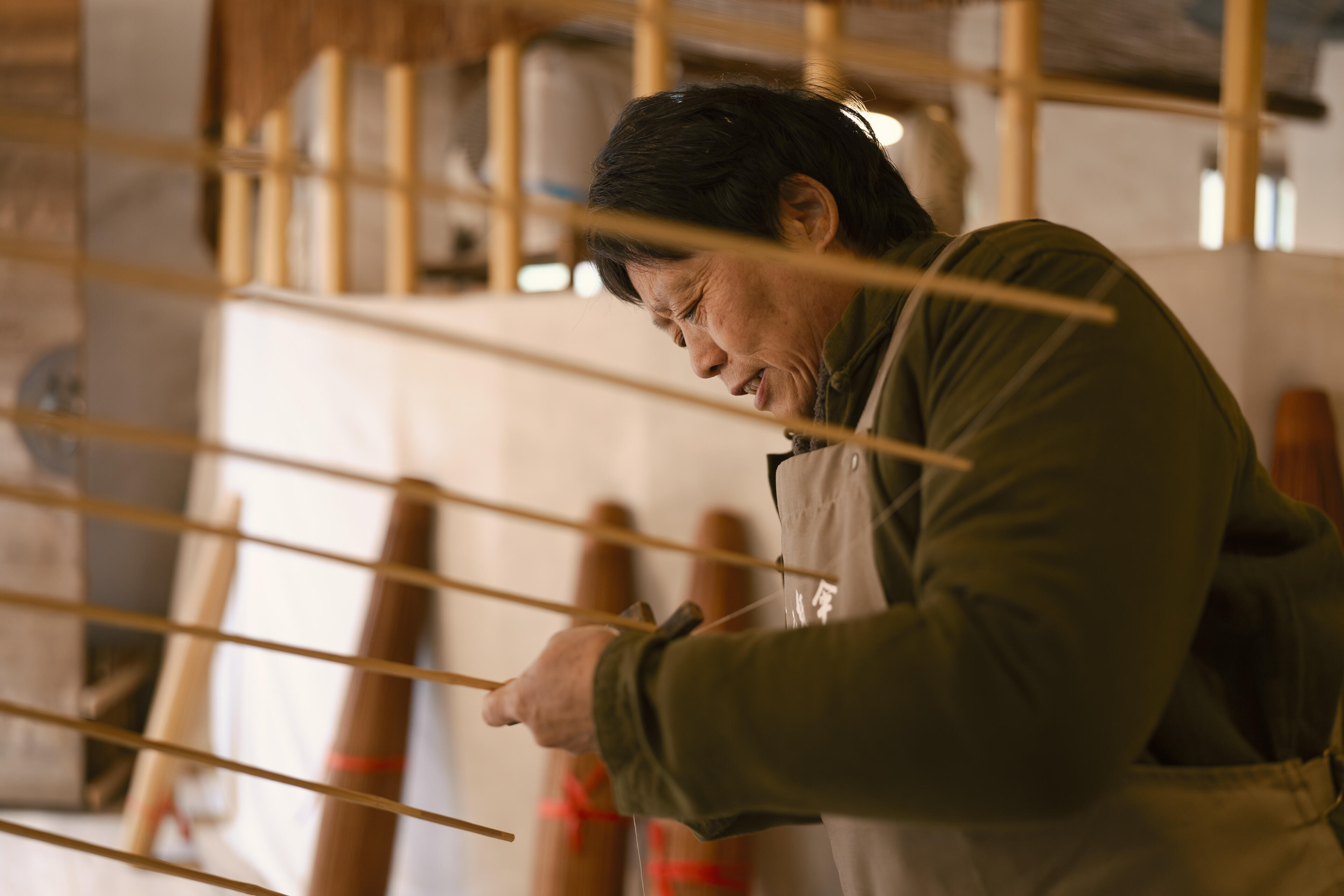 Such compact working environments truly test a lens’s adaptability. A focal length that is too wide can easily introduce excessive visual clutter, while one that is too narrow makes it difficult to fully convey the production process. The perspective of the Sigma 35mm F1.4 DG II | Art is perfectly balanced. When photographing steps such as shaping the bamboo ribs or pasting the umbrella surface, it captures both the artisans’ hand movements and the surrounding environment in a completely yet controlled way. The field of view never feels overly expansive or loose, allowing viewers to feel immersed in the scene and to experience the focus and delicacy of the craftsmanship firsthand.