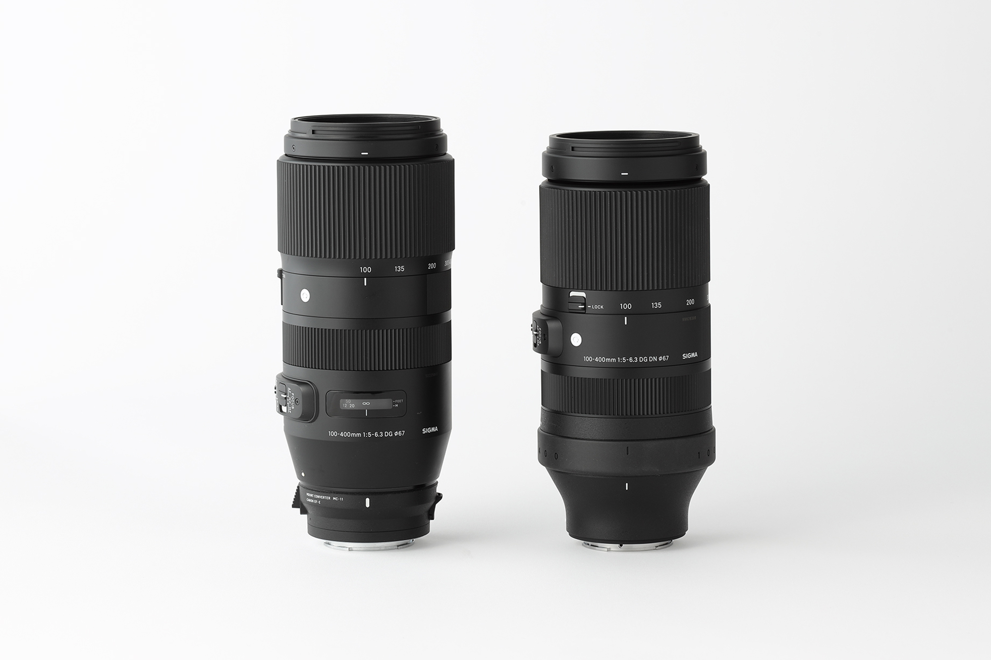 The new 100-400mm F5-6.3 DG DN OS | Contemporary is newly designed exclusively for mirrorless cameras. It is shorter than the 100-400mm F5-6.3 DG OS HSM | Contemporary (released in April 2017) with the MOUNT CONVERTER MC-11 for Canon EF Mount on the left. Besides, a comparison of lens construction diagrams provides the utmost evidence of the brand new design.