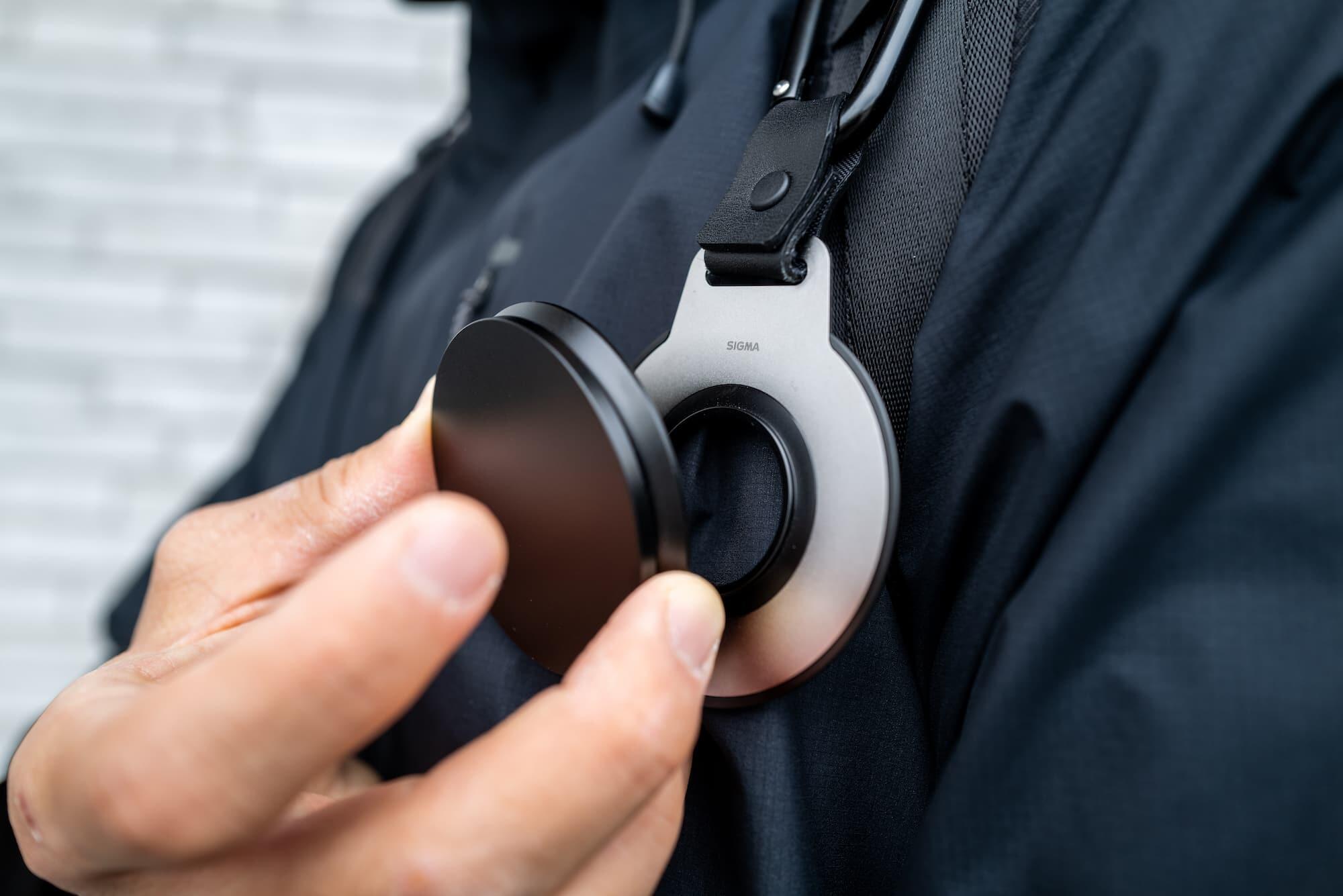 This is the lens cap holder for the magnetic lens cap. The cap attaches to it firmly and easily, and thanks to the carabiner I can easily attach the holder to a convenient location on my body