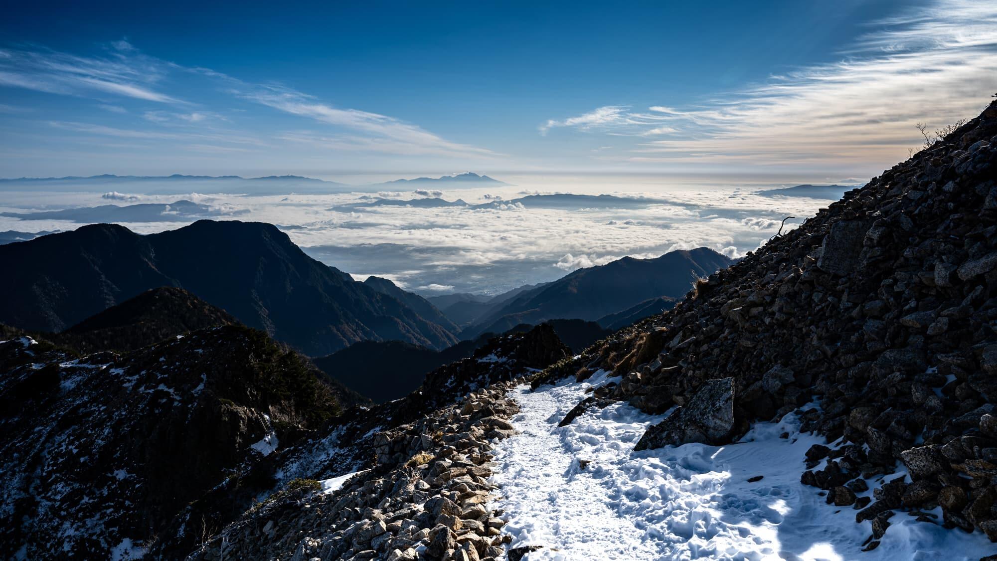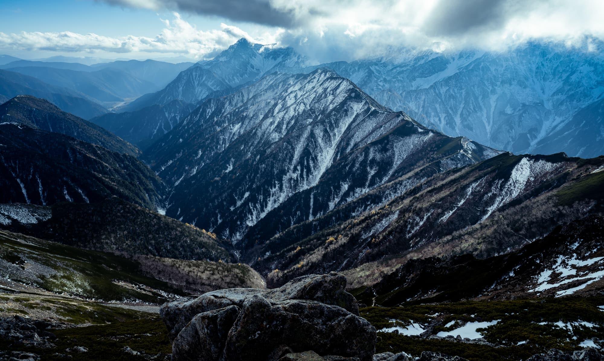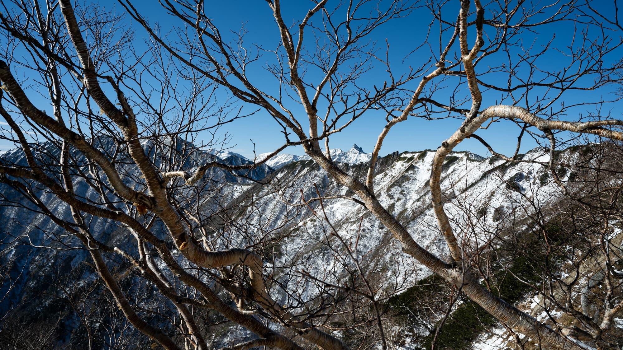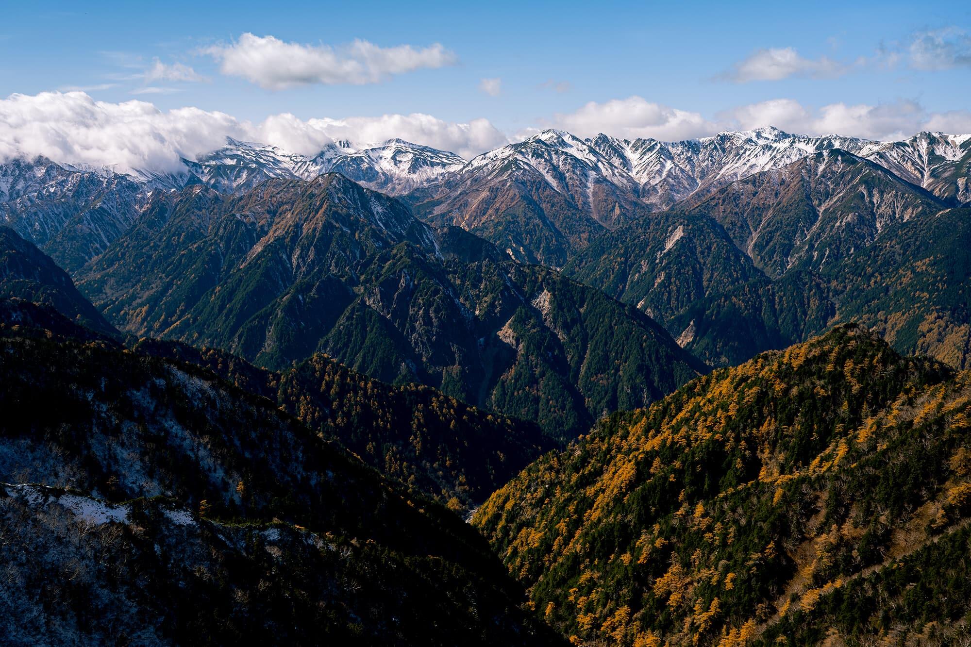 The ridge ahead of me stretched out to the north, all the way into Toyama Prefecture. Its peaks were covered by the first snow of the season, and I was treated to the rare sight of snow-capped mountains, red autumn foliage and green trees at the same time.