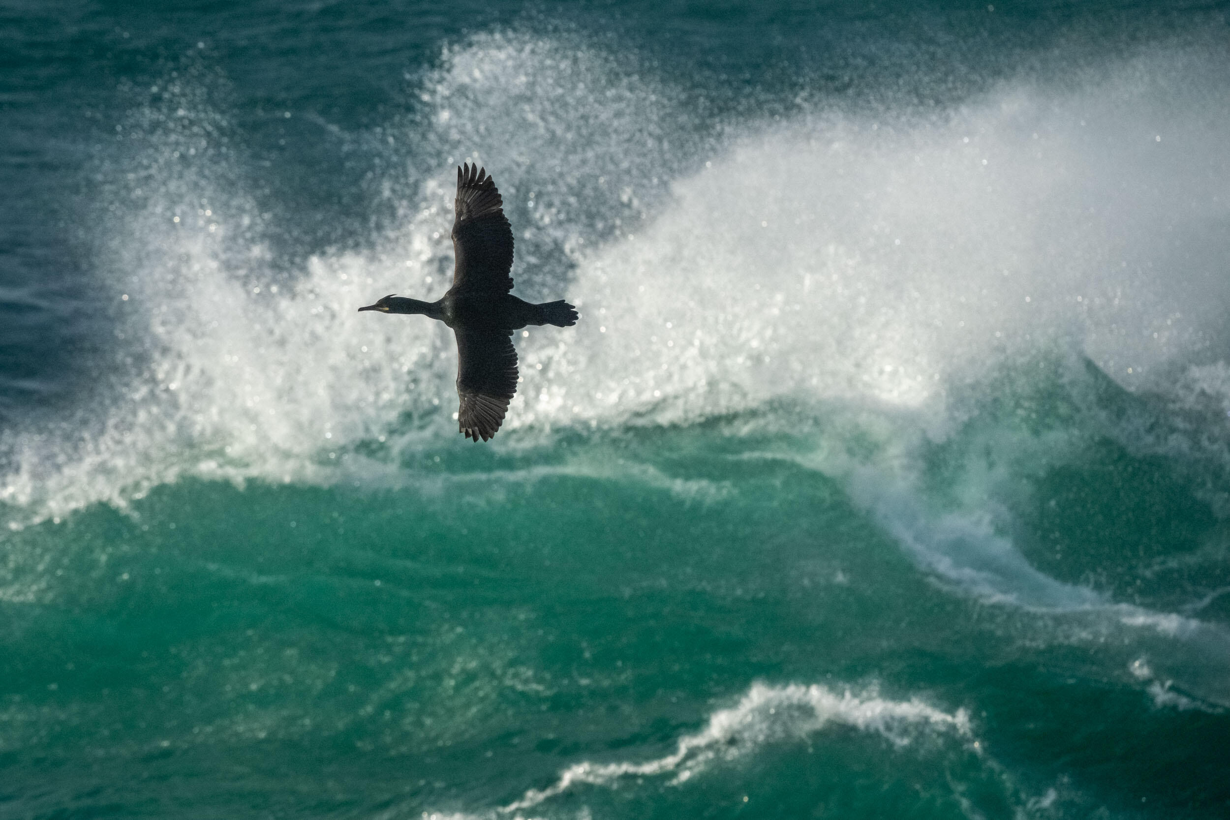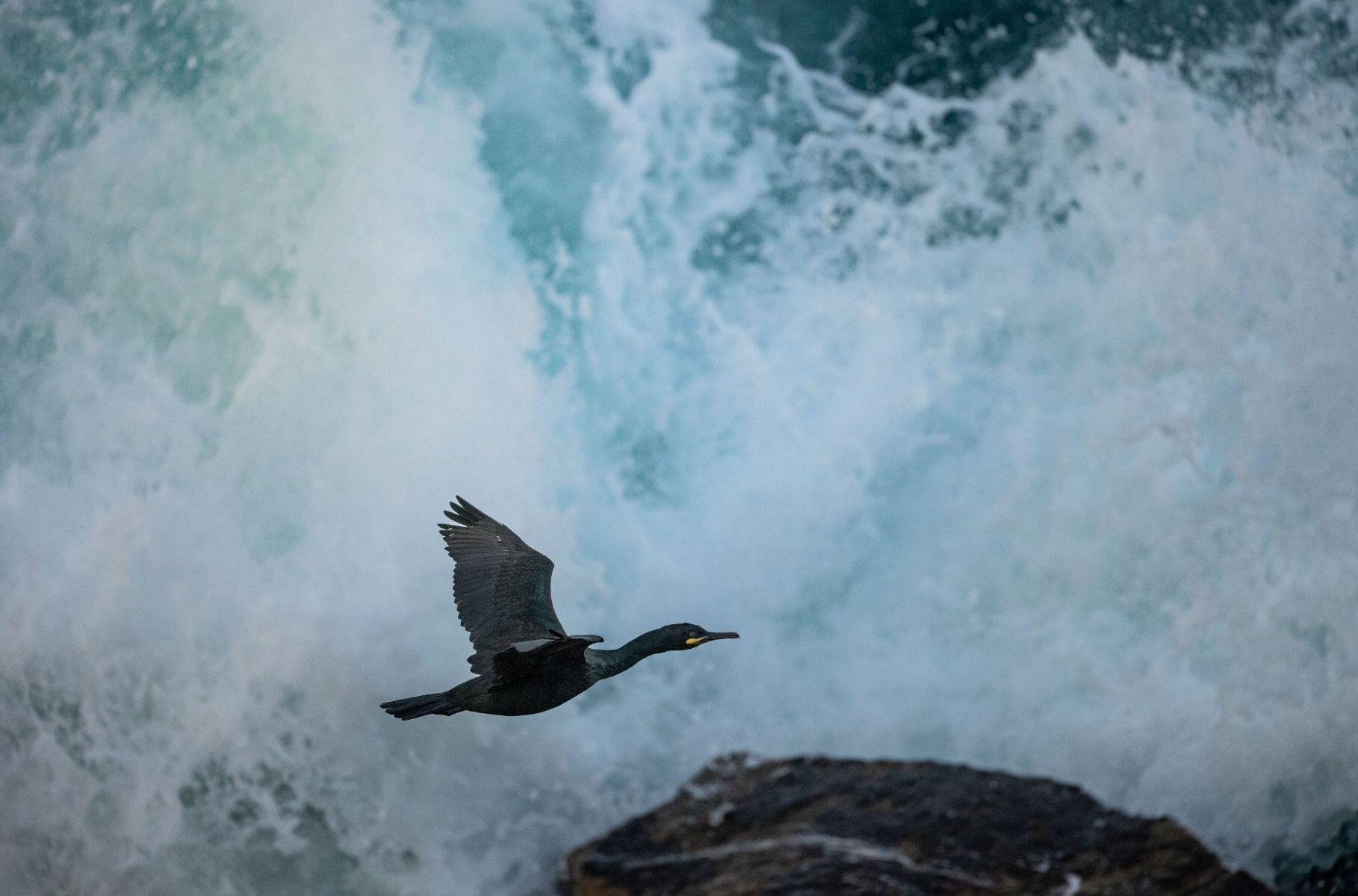 Once on the small promontory, I see that the cormorants, which spend their flight low enough to avoid the spray, often pass close to a place where the waves explode. I see one of them approaching with the right trajectory. I grab my camera, aim, and focus on the subject very quickly —the autofocus doesn't stall as I follow the bird's tricky path. For this entire series of pictures, my goal is to give as much importance to the birds as to the sea, so I must try to have a maximum depth of field in order to also freeze the details of the explosion of the wave in the background. That's why I shot most of the images in this series with apertures around F11 or even F16. This is now possible, as the sensitivity of our camera sensors has increased considerably.