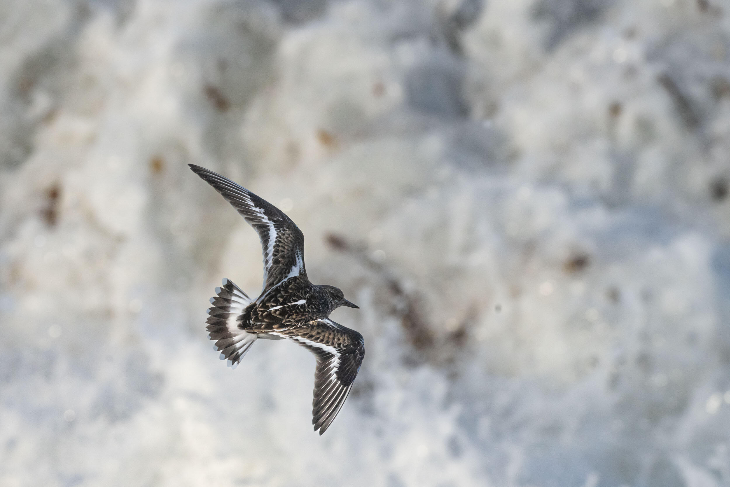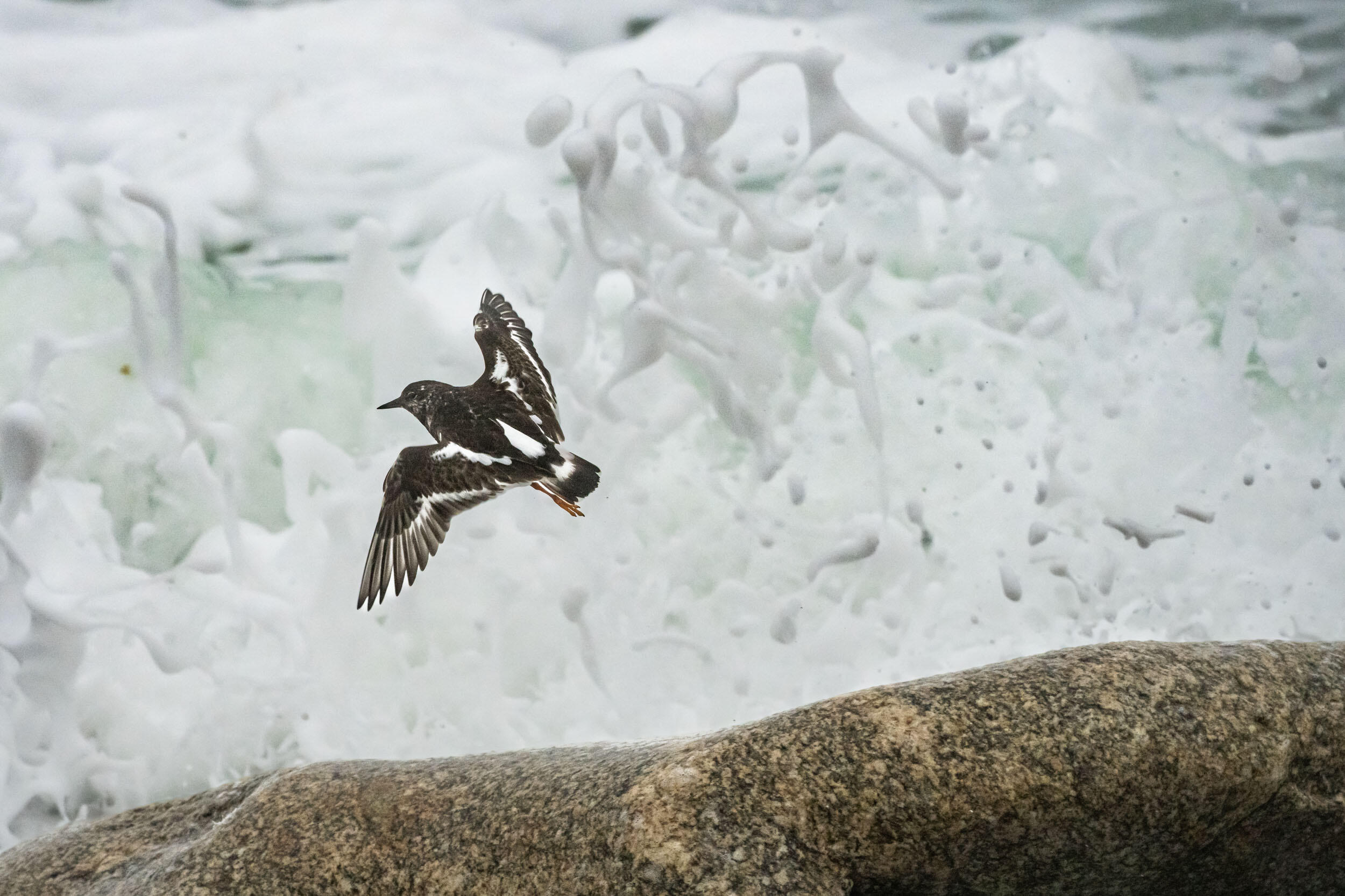 Time passes and the tide reverses. The waves then change direction and I decide to leave the point to reach a small pebble beach where the plovers like to come and play with the waves at ebb tide. I approach slowly so as not to disturb them, and keep a safe distance. I lie down on the pebbles at ground level and begin to follow their rapid movement. The lower the tide goes, the closer they get to the edge of the sea and the waves. Sometimes, they get too close and are surprised by the sudden burst of a wave. It was this moment that I had come to capture. It all happens in an instant, it's an extremely fleeting moment. The bird wanders very quickly between the pebbles, then, when the sound of the wave becomes threatening, freezes and suddenly flies away before the explosion of the wave on the rocks. It's practically impossible to anticipate in which direction the bird will fly, which makes this type of image very difficult.