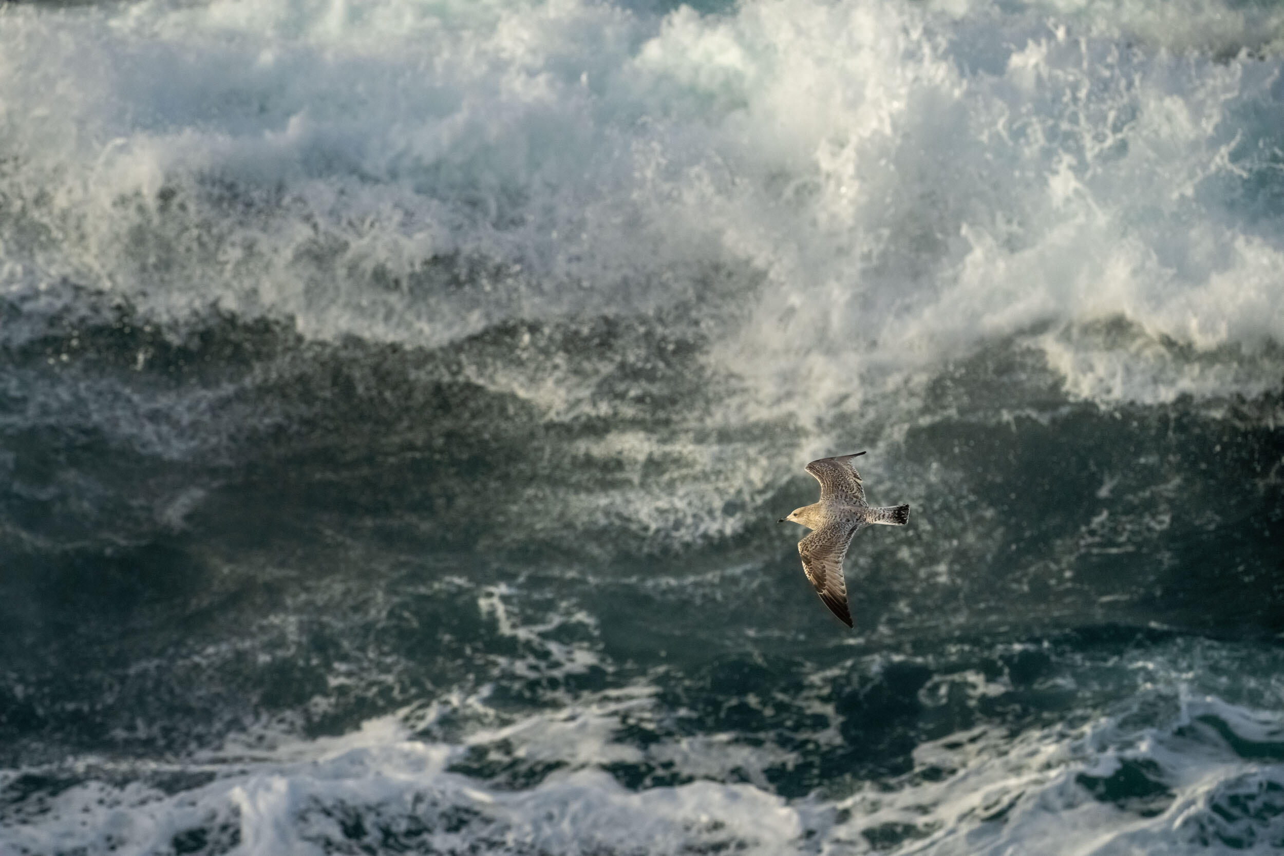 For this series of images, which I began more than ten years ago, two very ephemeral movements must come together: the flight of a bird with an uncertain trajectory and the explosion of a wave. Perseverance is essential for this type of image. Several times I have spent entire days in the storm waiting for a bird to pass by at the right moment and photographed nothing. This can be frustrating, but I think it's necessary for a photographer to push back their limits.