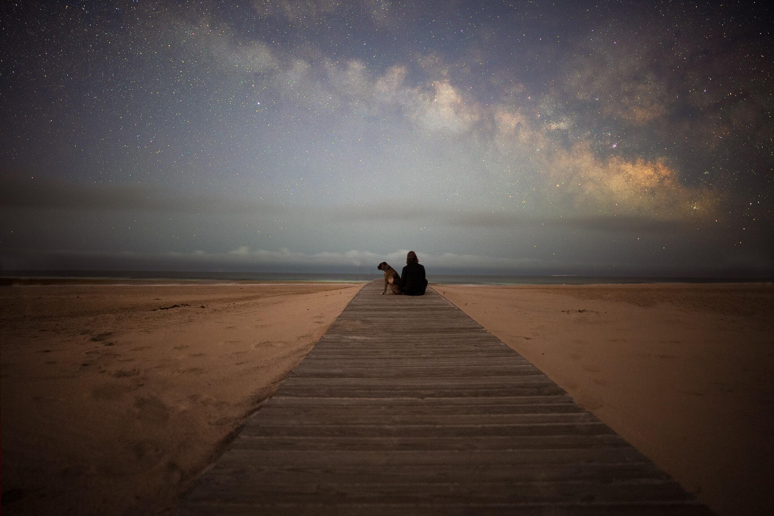 Heading south from Ithaca, Kona and I ventured to Assateague National Seashore in Maryland. The skies here are a bit darker and would be a great place to break out my star tracker. By mounting my camera to the polar aligned tracking device, my lens and camera would continue to point at the same spot in the sky as the Earth rotates. This eliminates the need for shorter exposure times, but does require a separate foreground exposure. After my sky exposure of the Milky Way was captured, I used my phone as a remote monitor for my camera and found the perfect spot along the pathway for Kona and I to sit under the stars. We captured this just in time for an unfortunate amount of fog and clouds to hide the stars for the remainder of the night.