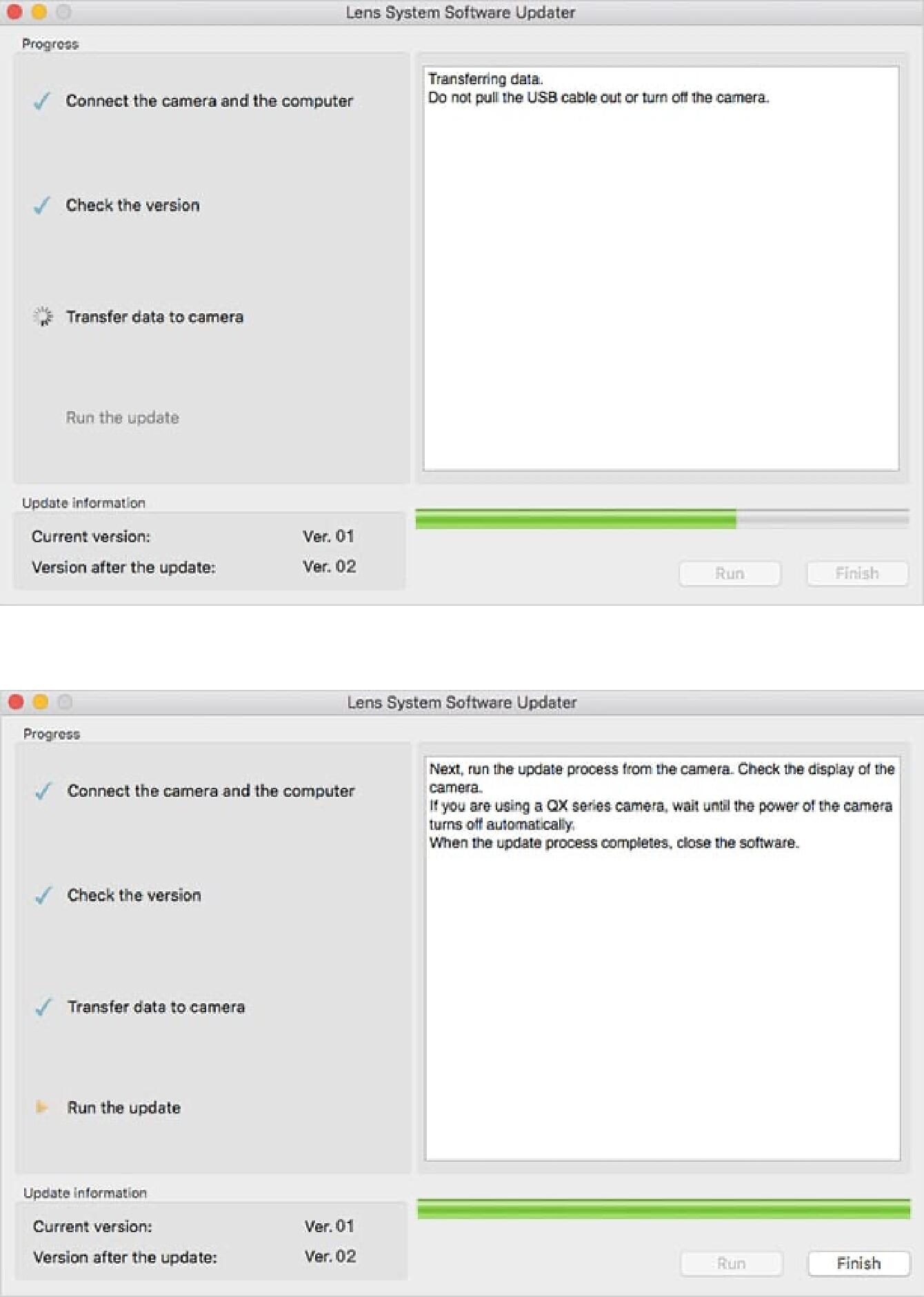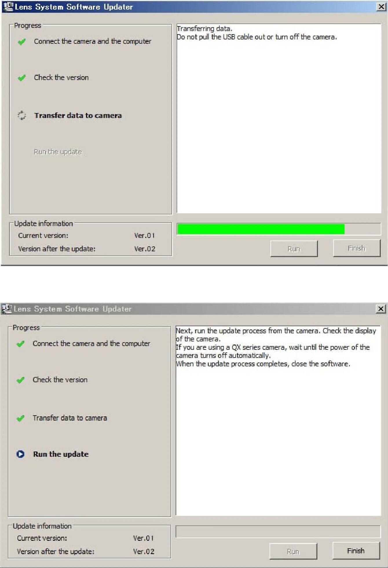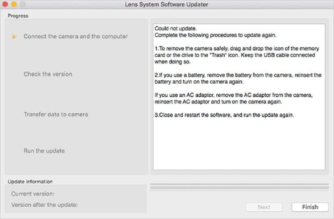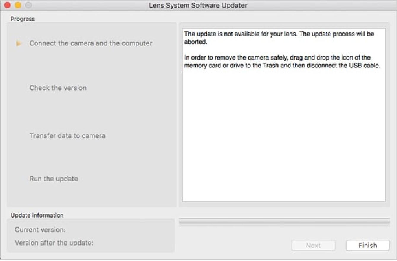 In the case of “The update is not available for your lens” message appears, check the Lens System Software Updater is compatible with the lens to update.