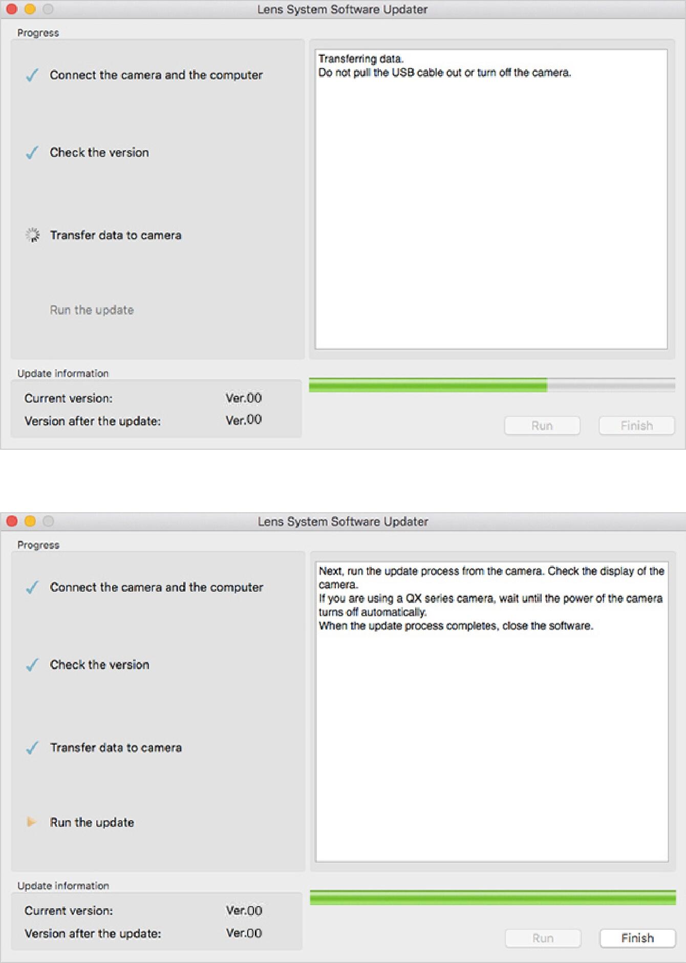 In the case of “The update is not available for your lens.” message appears, check the Lens System Software Updater is compatible with the lens to update.