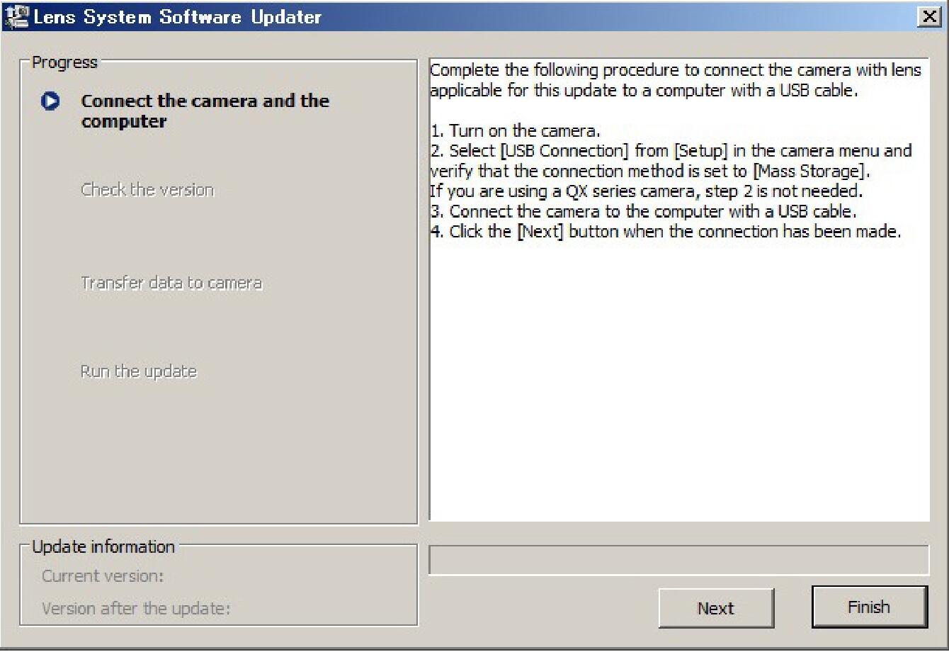 In the case of “The update is not available for your lens” message appears, check the Lens System Software Updater is compatible with the lens to update.