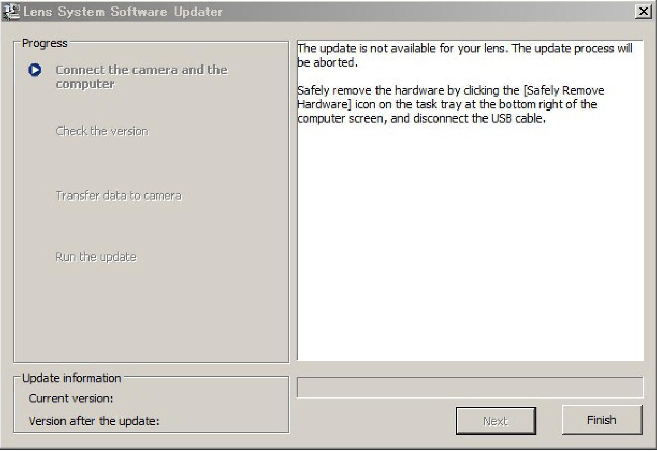 In the case of “The update is not available for your lens” message appears, check the Lens System Software Updater is compatible with the lens to update.