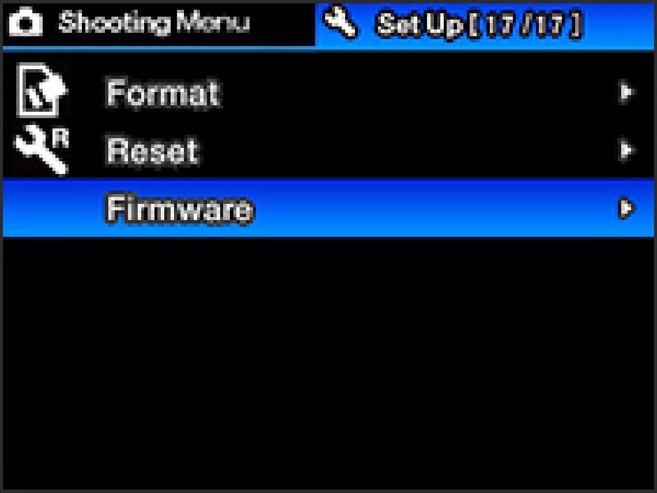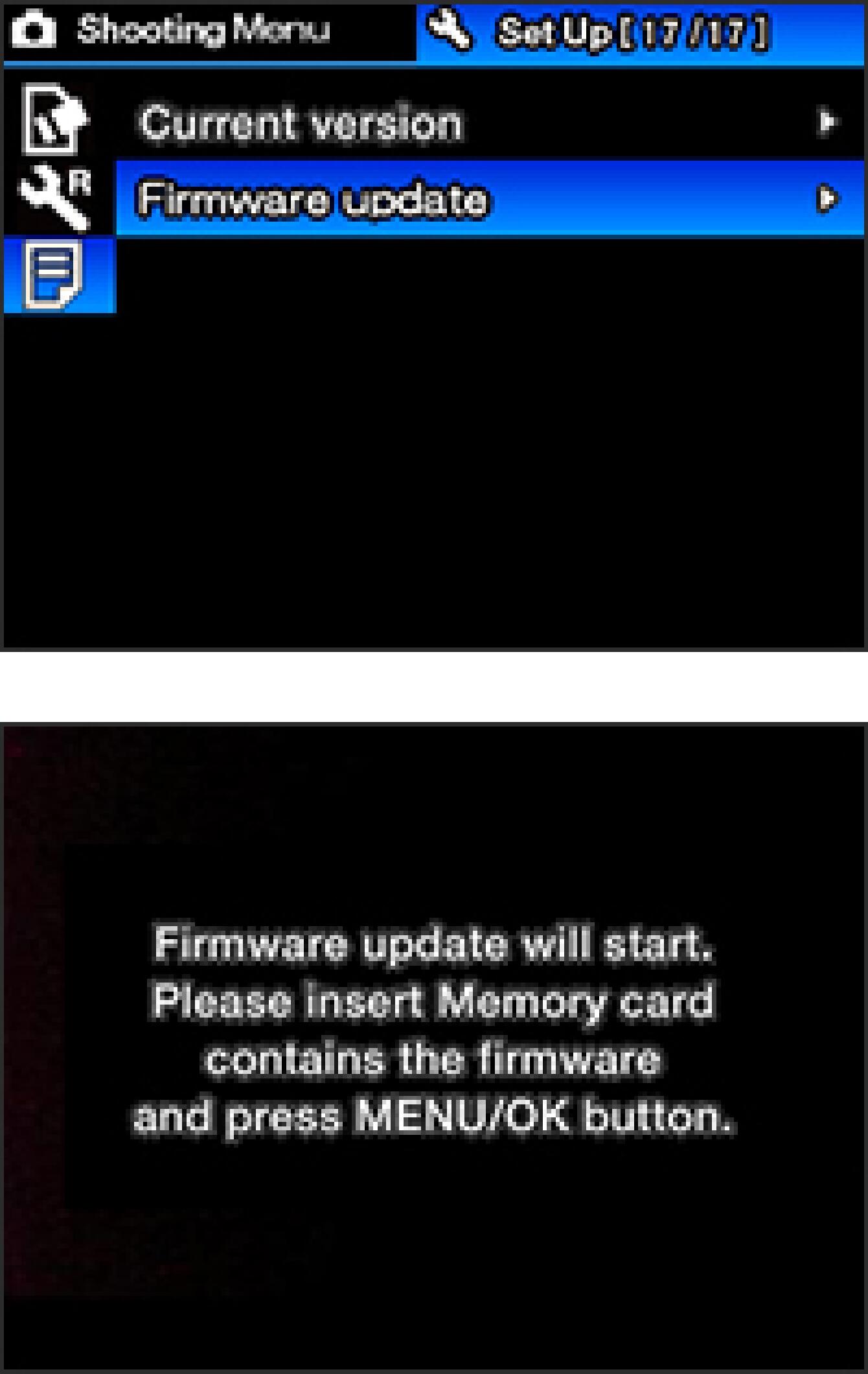 Press the right button of the 4-Way Controller to open the sub menu and select “Firm update”, then press the MENU/OK button to display the following message.