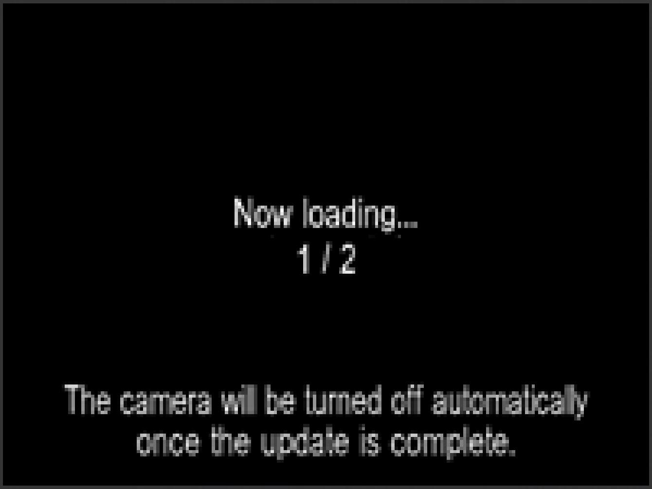 When the message “Firmware update is complete. The camera will be turned off automatically.” is displayed, the first update is complete.* Please do not operate the camera until the message “Firmware update is complete.” appears.