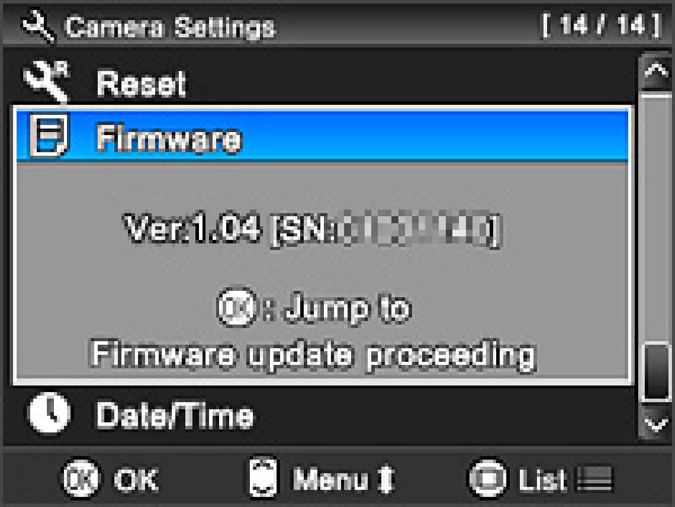 Select “Firmware” from the Camera Settings menu and press the OK button. The Firmware menu will be displayed.