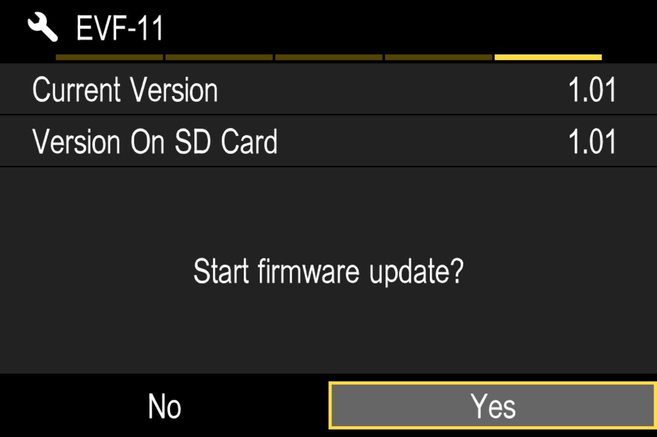 Check the “Firmware Update>EVF” version in the setup menu and confirm the ELECTRONIC VIEWFINDER EVF-11 version is updated to Ver. 1.01.
