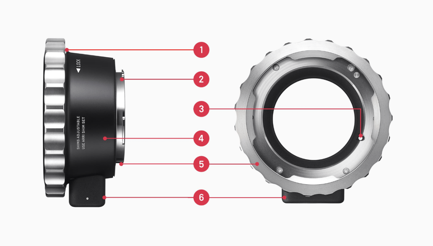 MC-31 has shim adjustments on two points of the mount. Adjustments can be made with a shim kit (Supplied) on the camera side of the mount 2 ,or a shim for ARRI digital cameras on the lens side 1 .
