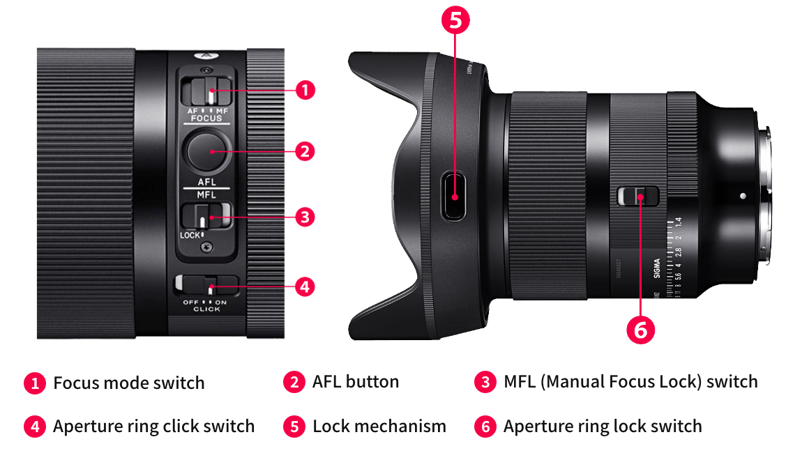 Thoughtful features such as a focus mode switch, a customizable AFL* button, and an aperture ring lock switch enhance the lens usability. An aperture ring click switch can be used to turn the aperture ring click on and off, allowing photographers to enjoy the sound and feel of the click, as well as smooth aperture operation during video recording.