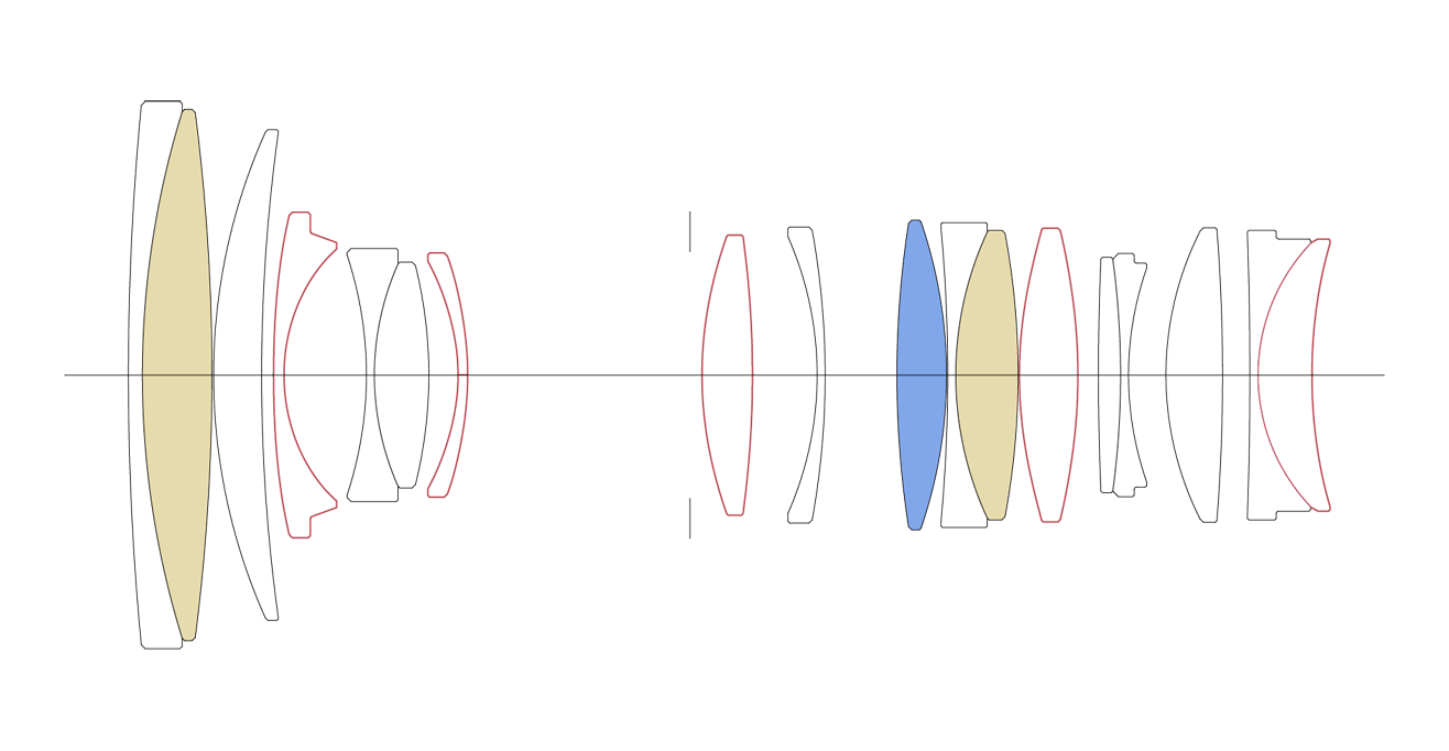18 elements in 13 groups (2 FLD, 1 SLD, and 5 aspherical elements)
