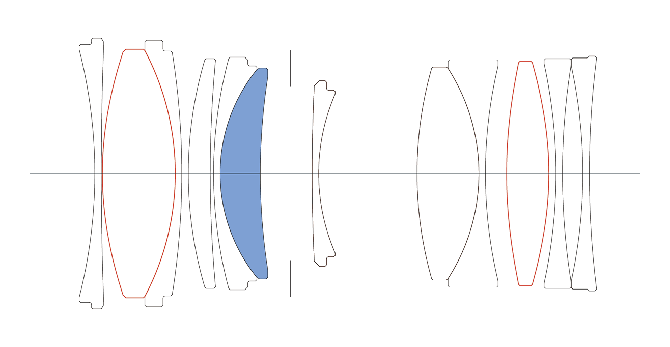 12 elements in 9 groups (1 SLD glass and 2 aspherical lenses)
