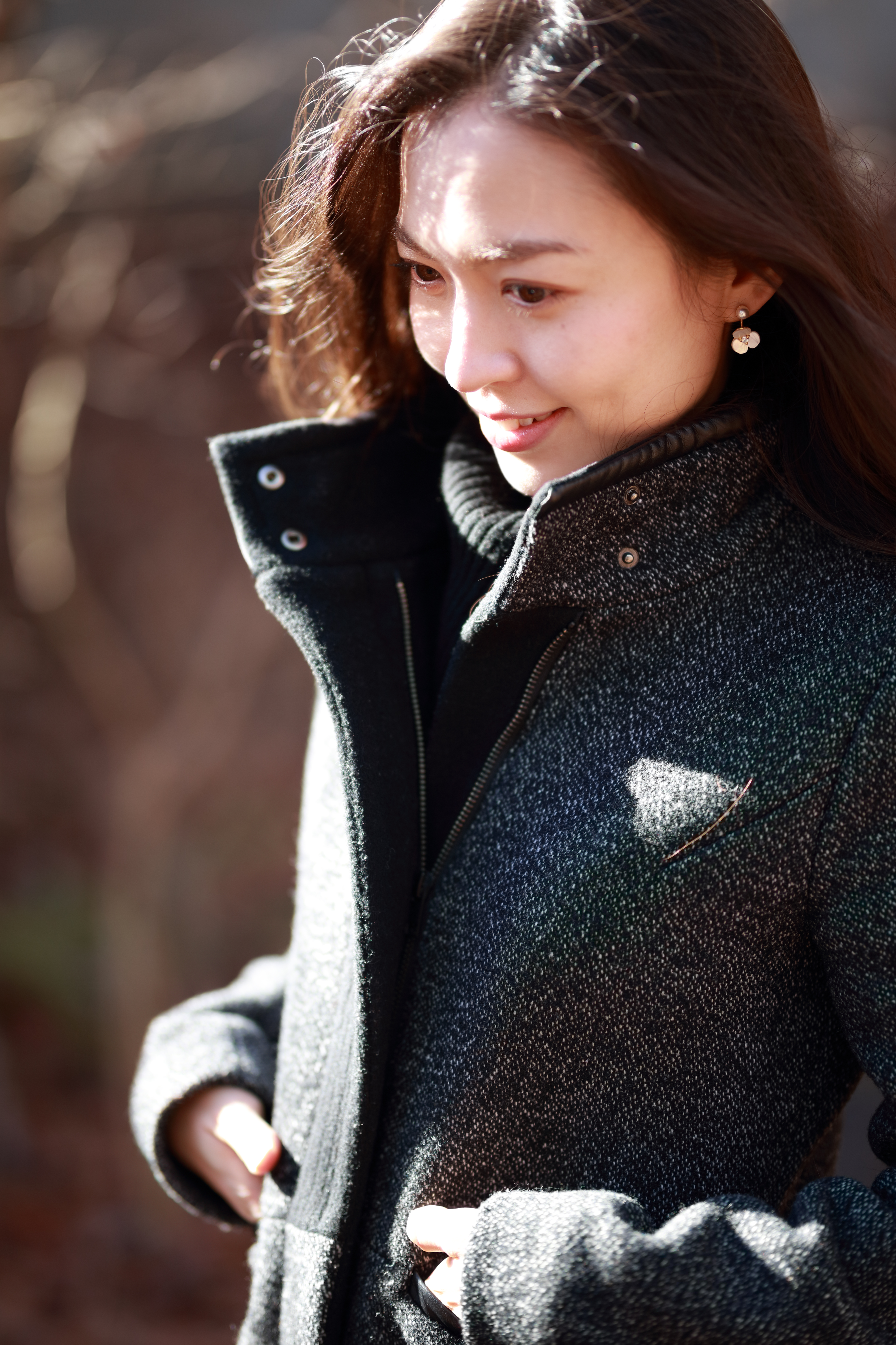 Walking around the neighborhood. The sunshine feels warm, but it was freezing cold. I focused on her right, better-lit eye. This picture reproduces the atmosphere faithfully. You can tell that I shot from some distance because of the composition, but the defocusing effect of the foreground is still very strong. Yet, the bokeh doesn’t look as if everything was completely dissolved: it still looks substantial. Without this bokeh taste, I wouldn’t be able to get the desired results.