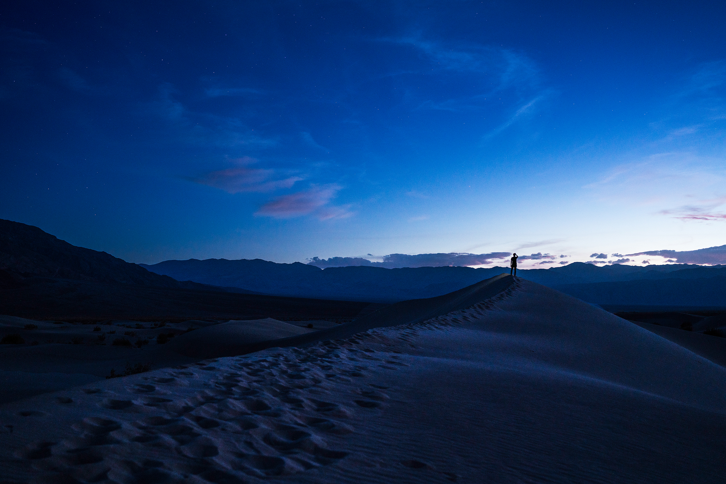 I decided to start my evening at the Mesquite Sand Dunes with hopes of catching the zodiacal light after sunset. While known for being a very faint glow, I was blown away by how brightly visible it was due to the lack of light pollution. Although I spent some time taking photos during blue hour, I had my composition already picked out for capturing the zodiacal light. Shooting the foreground of my vertical panorama allowed me to run up the dunes in the distance adding some much-needed scale to the image.