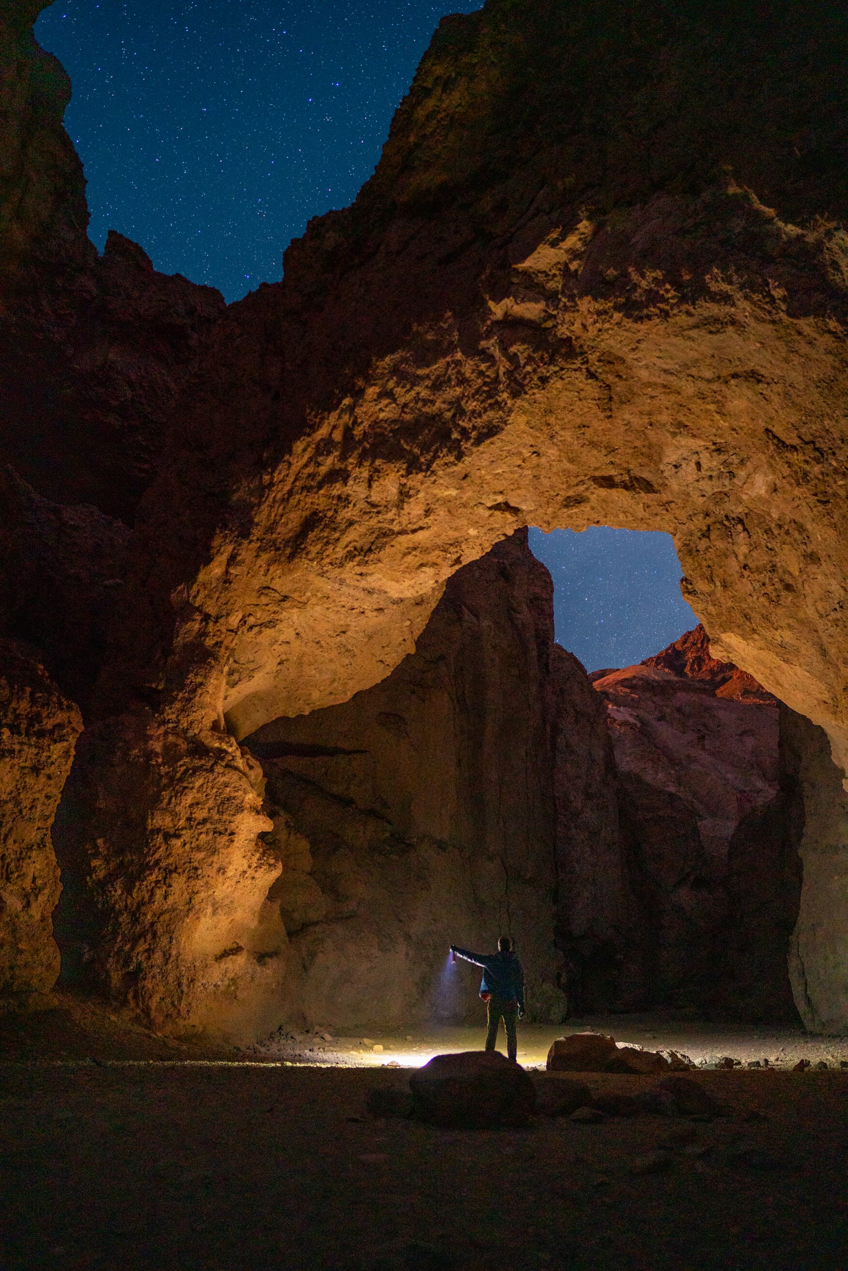 Although I was happy with how the lighted scene would work, I wanted to take one more image to help emphasize the massive scale of this arch. I set another timer and used my headlamp as a lantern to help light the scene while standing in it. Click, run in to place, hold still, hold still, run back and review. A few tries and I was stoked on the results.