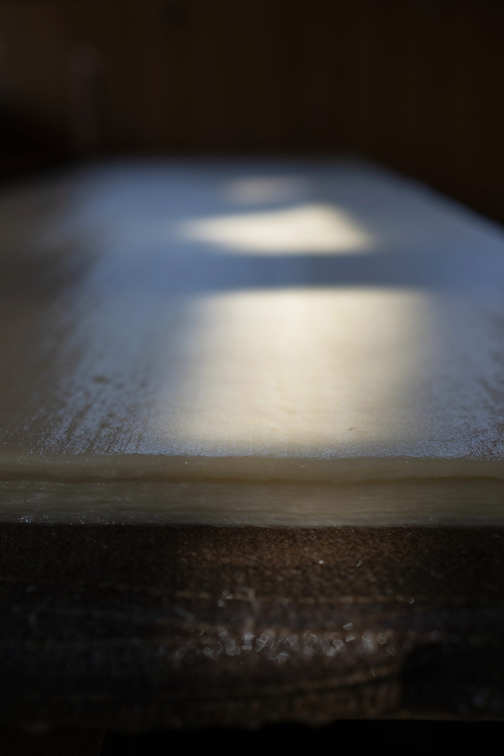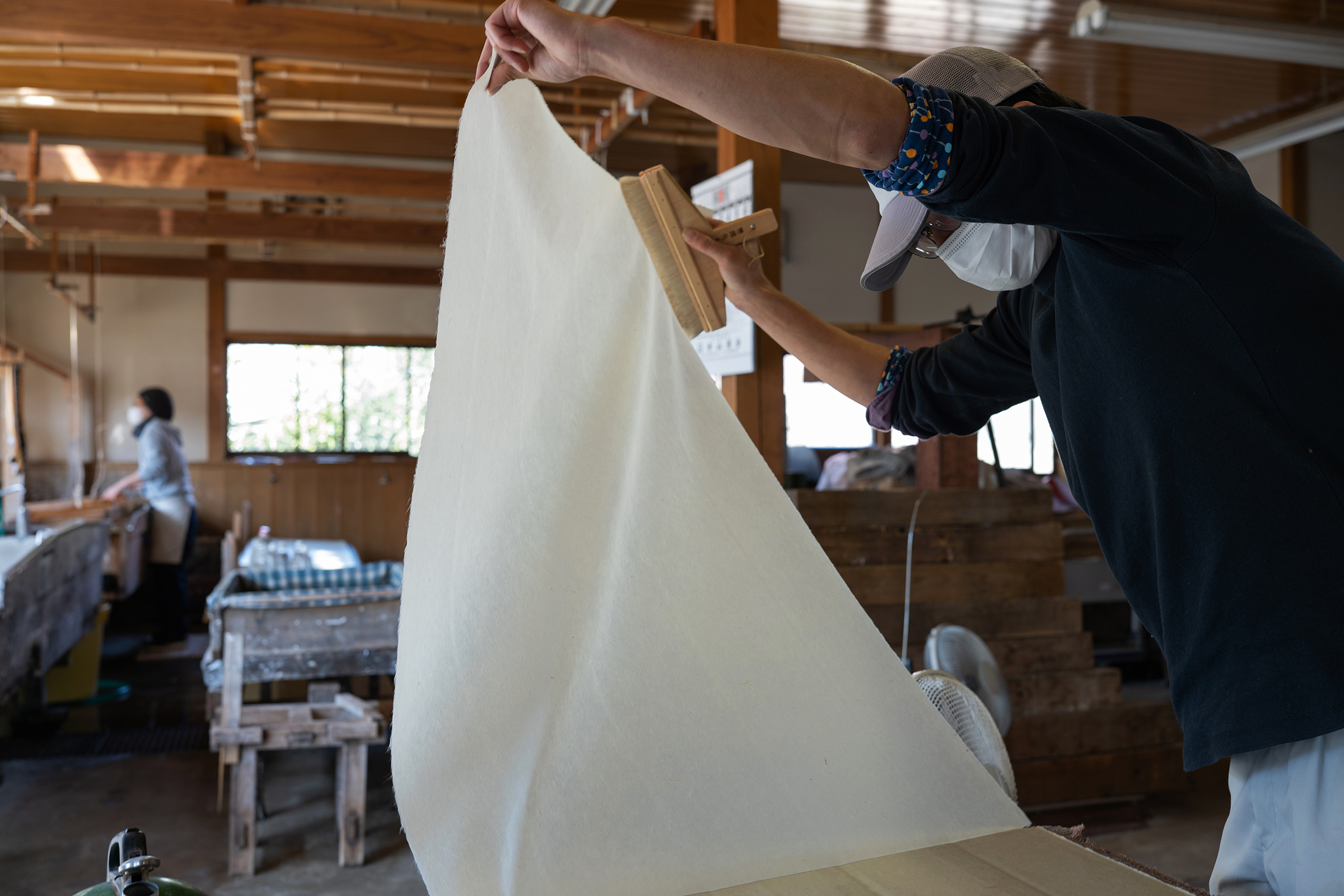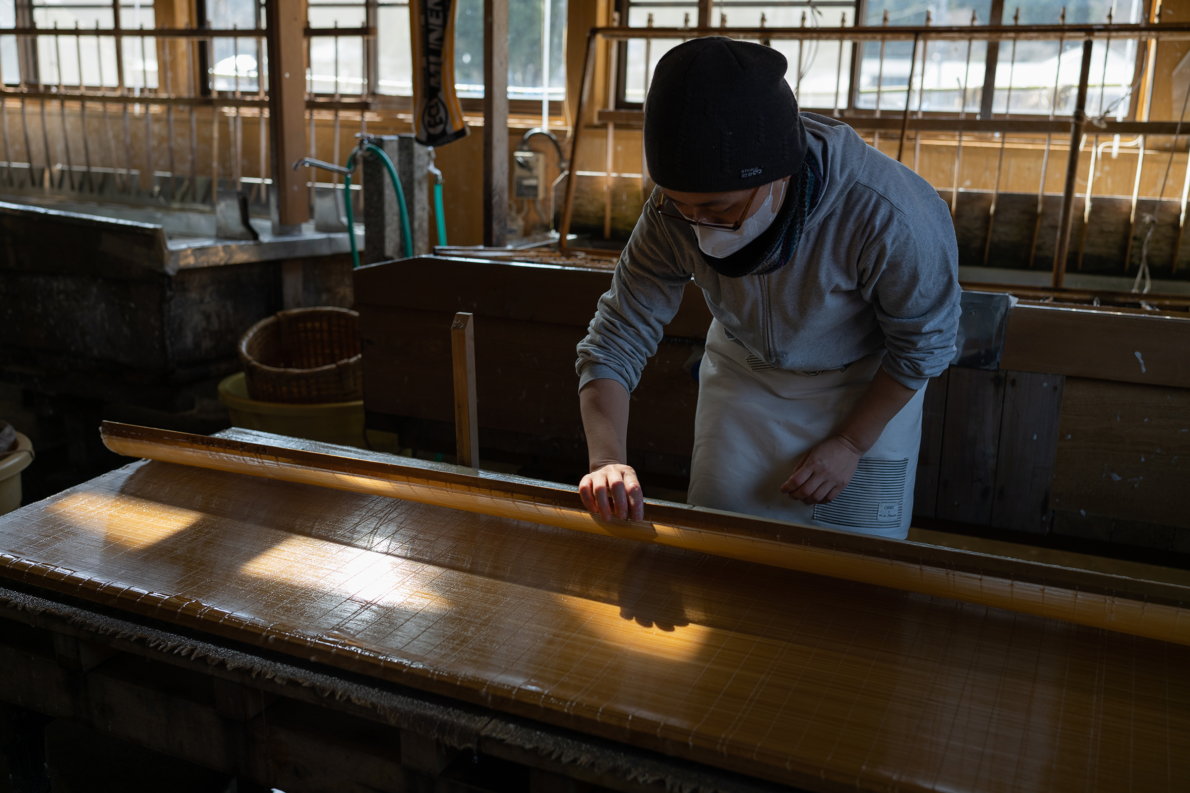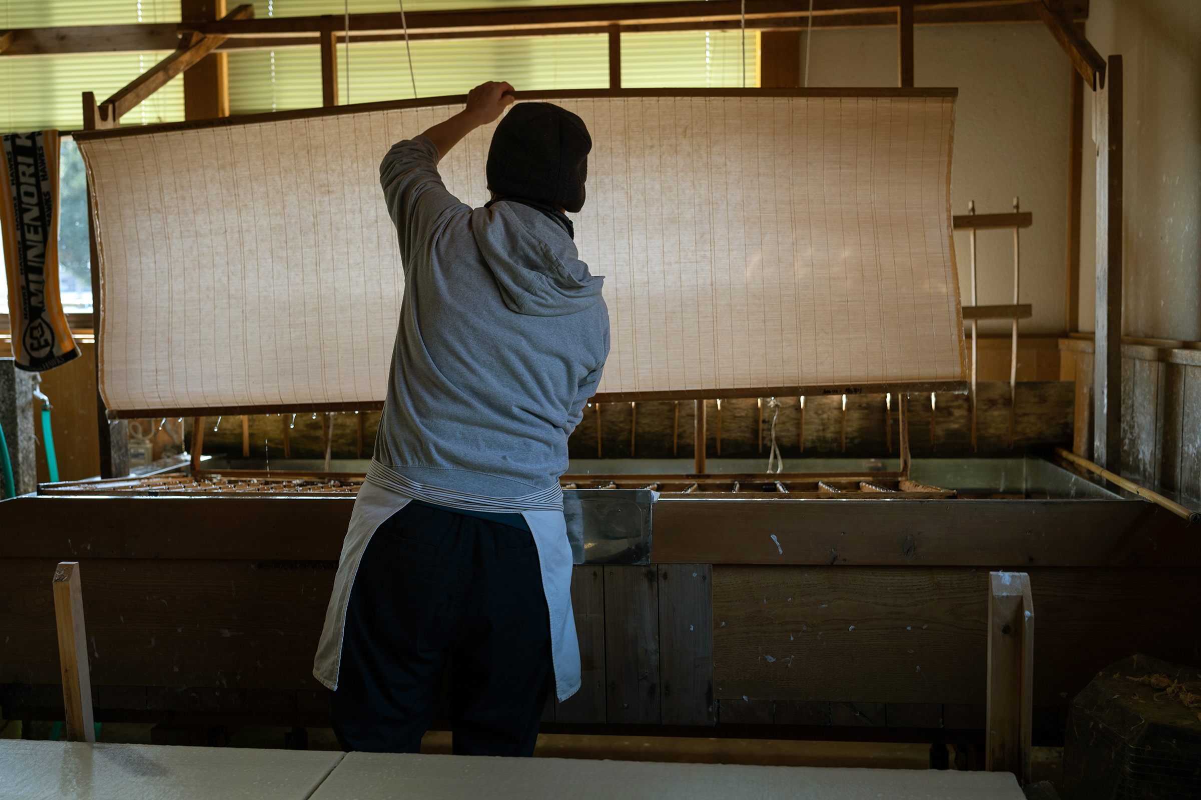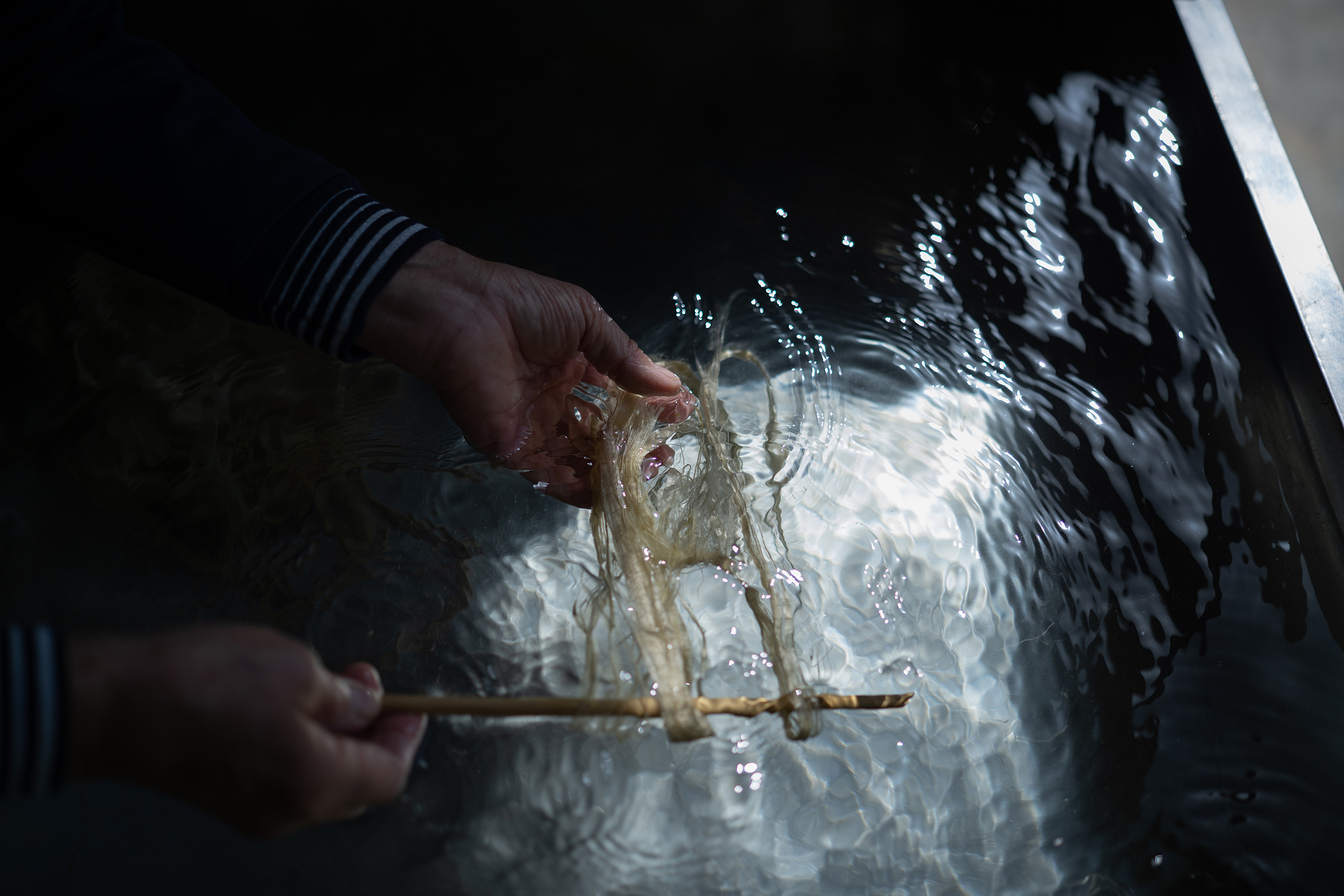 Paper and photography have been linked from the very beginning. Photography was born from the desire of people to preserve the image the camera obscura displayed. Paper is the way to fix forever what the camera saw only once. I am really grateful to have had this opportunity to document the washi making process in this small workshop. Everything there was perfect for photography. Firstly, because of the natural light used to check the paper's quality, and secondly because of the precise and repetitive movements needed in washi-making. As a photographer I have to be invisible in these situations; I'm there to document, in the most natural and candid way, how the people work and use their workplace. That's why knowing my lens and my framing is the most useful skill. I can join in the movements; I don't have to think which lens I should use, which distance to stand. I know all that so I can work at the same rhythm as the washi maker. As he is moving, I am moving, too. When I embrace this tempo, I can capture the image I want.