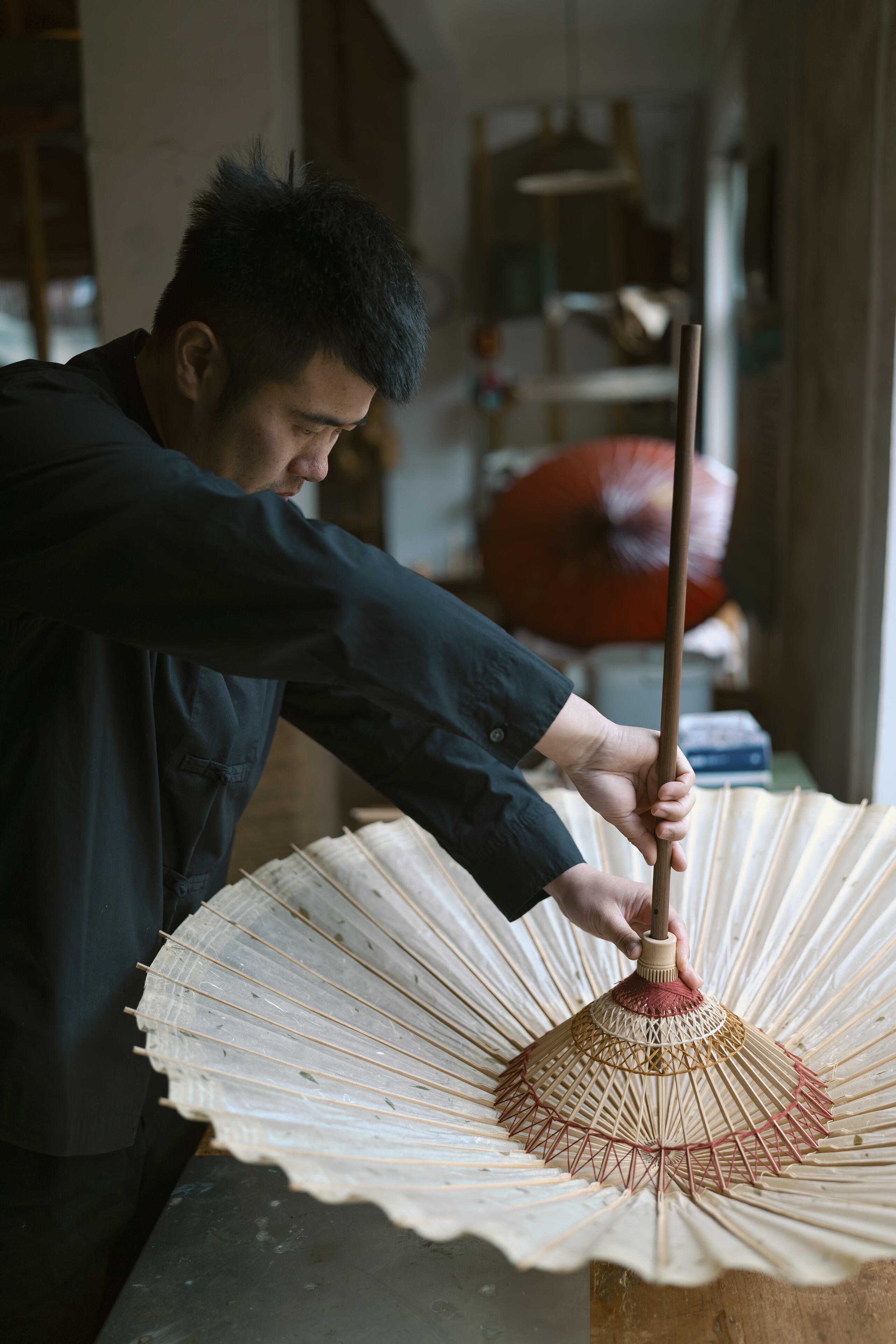 Such compact working environments truly test a lens’s adaptability. A focal length that is too wide can easily introduce excessive visual clutter, while one that is too narrow makes it difficult to fully convey the production process. The perspective of the Sigma 35mm F1.4 DG II | Art is perfectly balanced. When photographing steps such as shaping the bamboo ribs or pasting the umbrella surface, it captures both the artisans’ hand movements and the surrounding environment in a completely yet controlled way. The field of view never feels overly expansive or loose, allowing viewers to feel immersed in the scene and to experience the focus and delicacy of the craftsmanship firsthand.