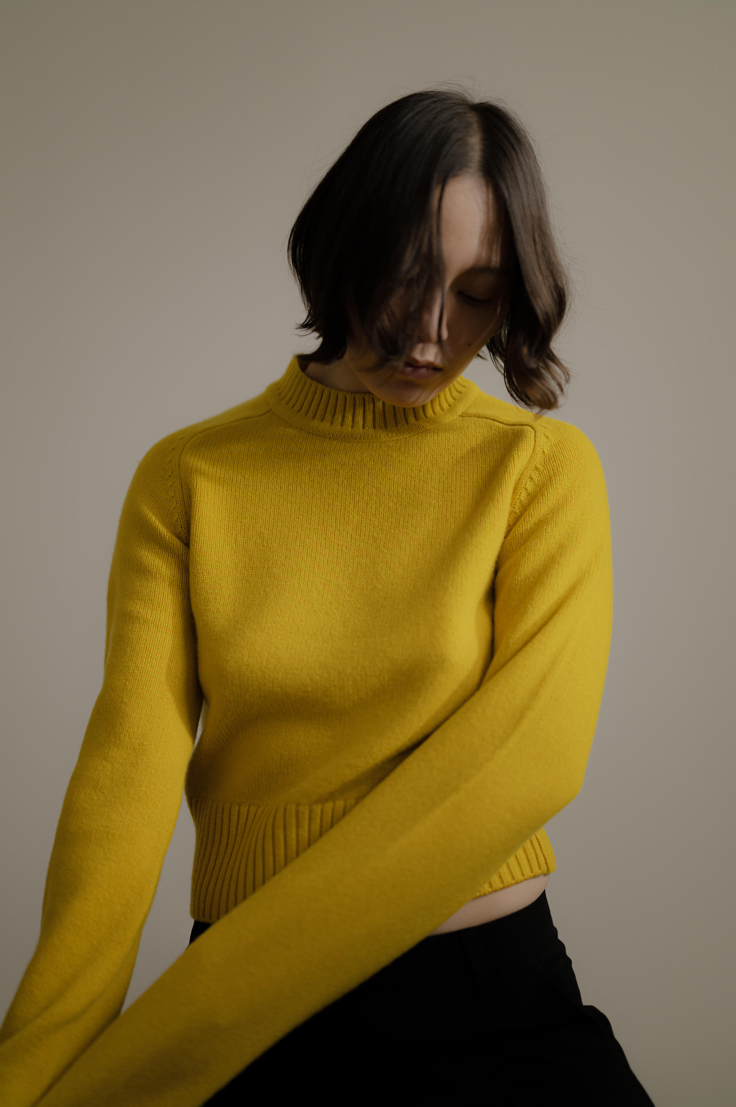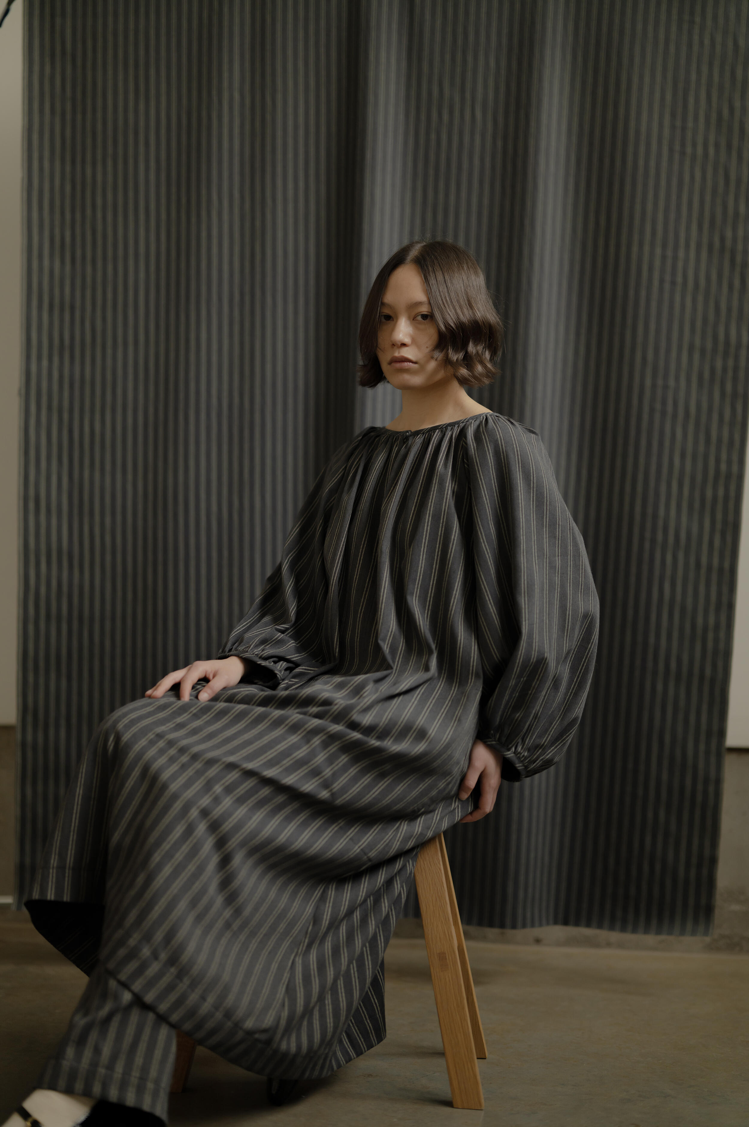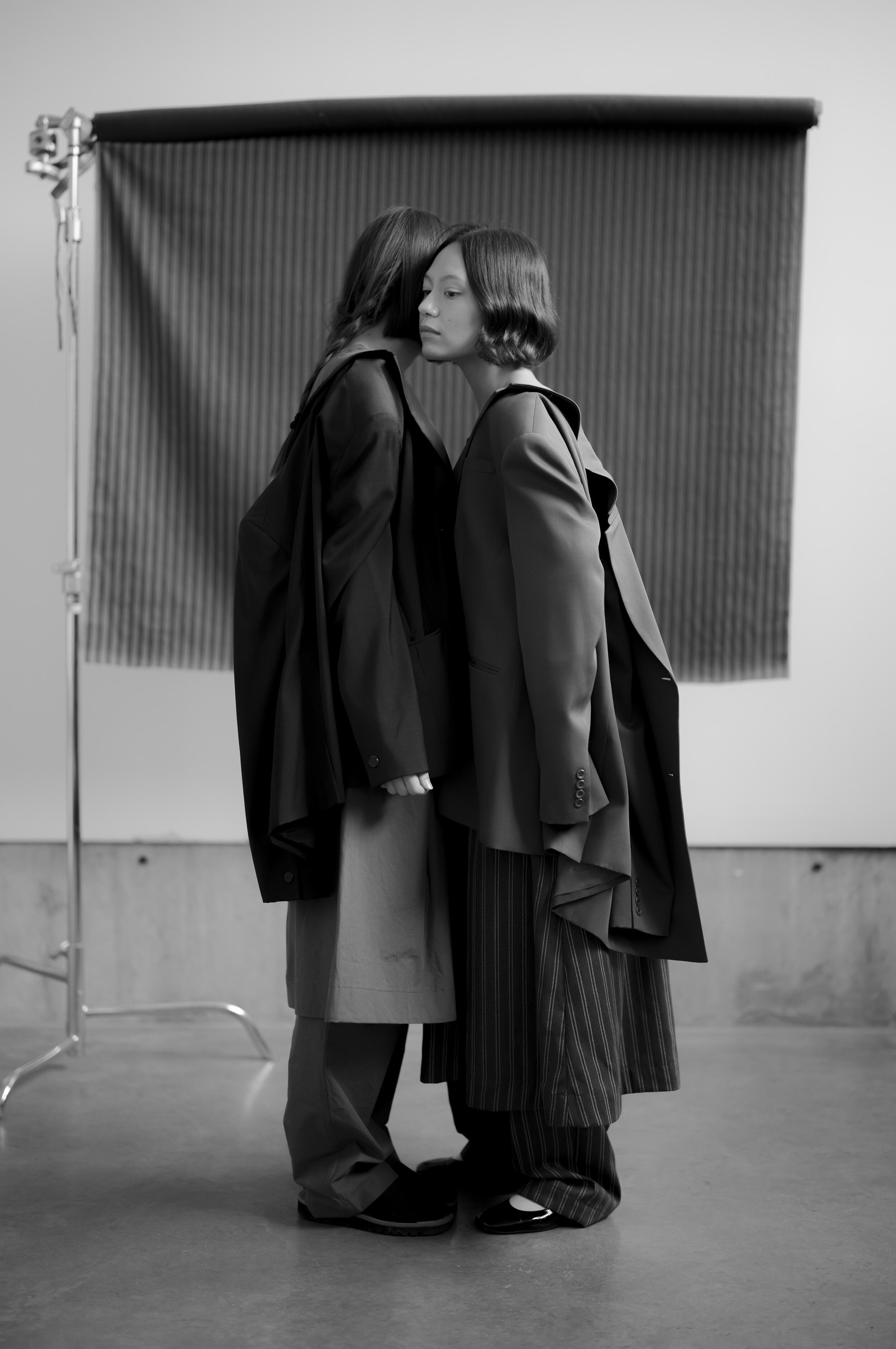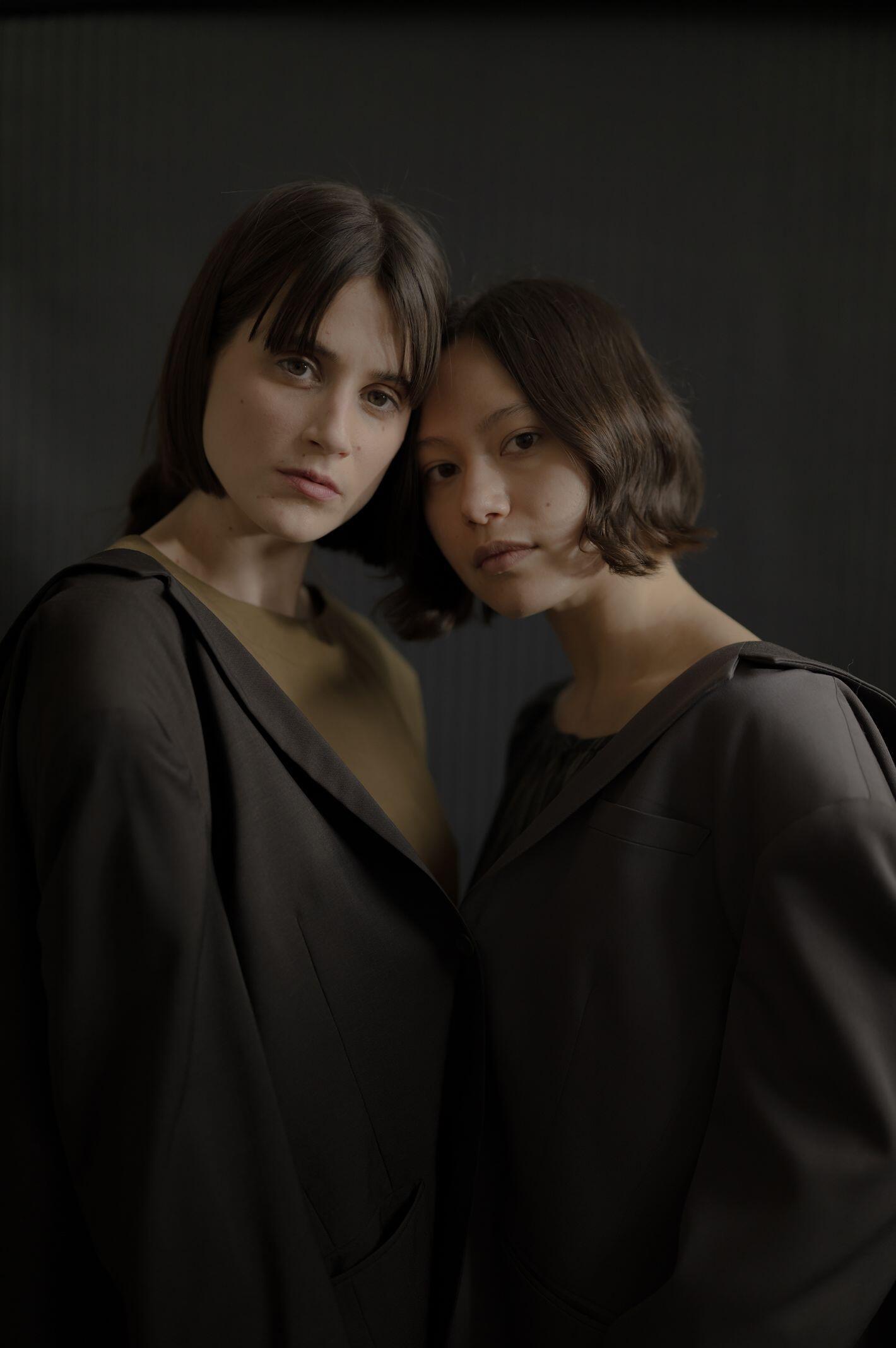 I shot with two subjects (Iona Catherine & Kaya Noteboom) as a way to capture individual talents, but also combine them in the frame to play with foreground, background, and the visually pleasing result of these features when shooting at a wide aperture. A mix of natural light and constantly controlled lighting allowed me to explore both situations within the same environmental parameters. Iona Catherine explored a styling concept & art direction, matched with backdrops and production design responding sometimes directly to the garment and its tones and patterns as a way to create a matching environment, which also contrasts with subjects when shot wide open.
