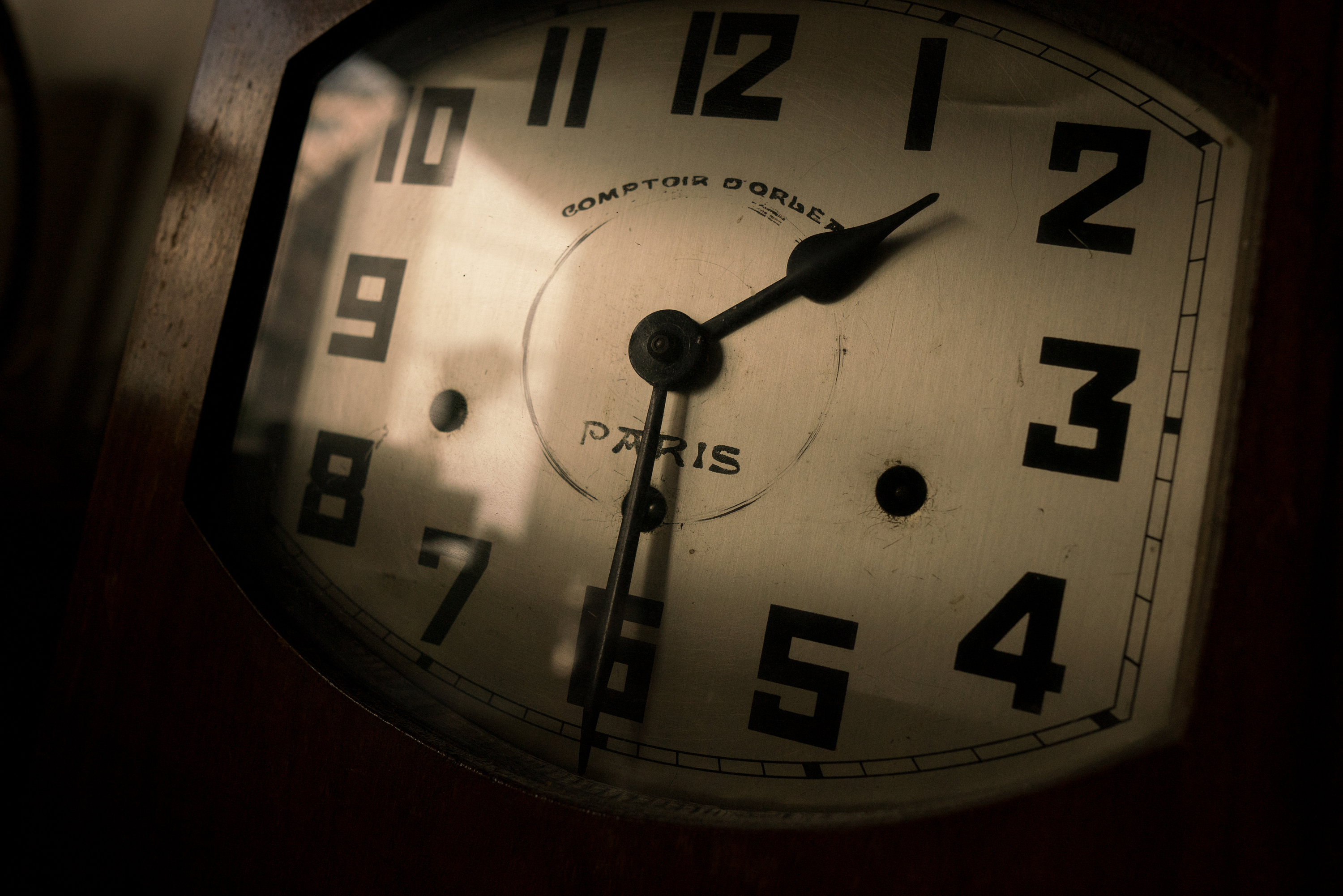 An antique wall clock in the dim light. While the focal peak is very sharp, the defocused parts lose their lines smoothly. In addition, the light diffused by the roll screen looks realistic.