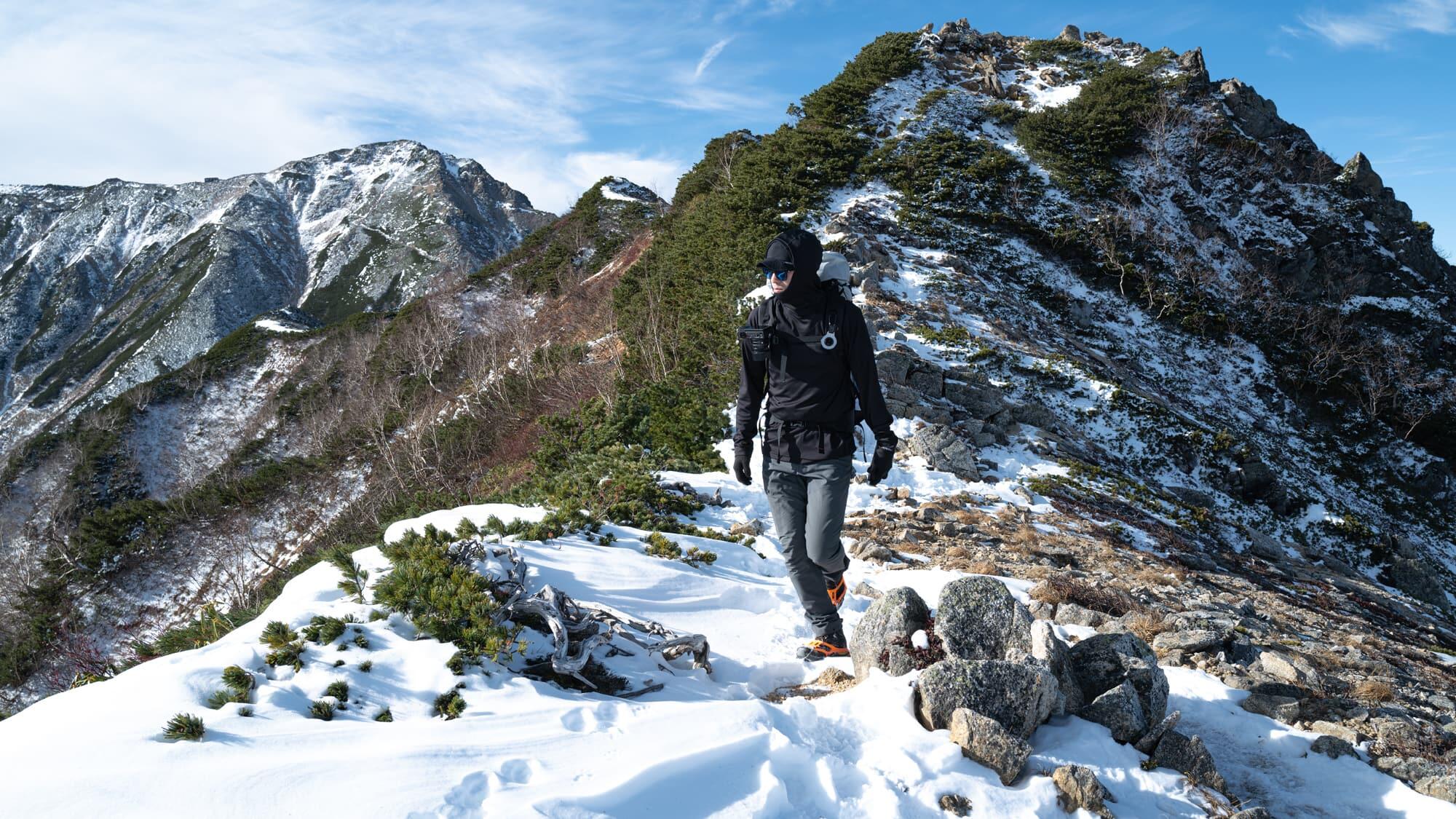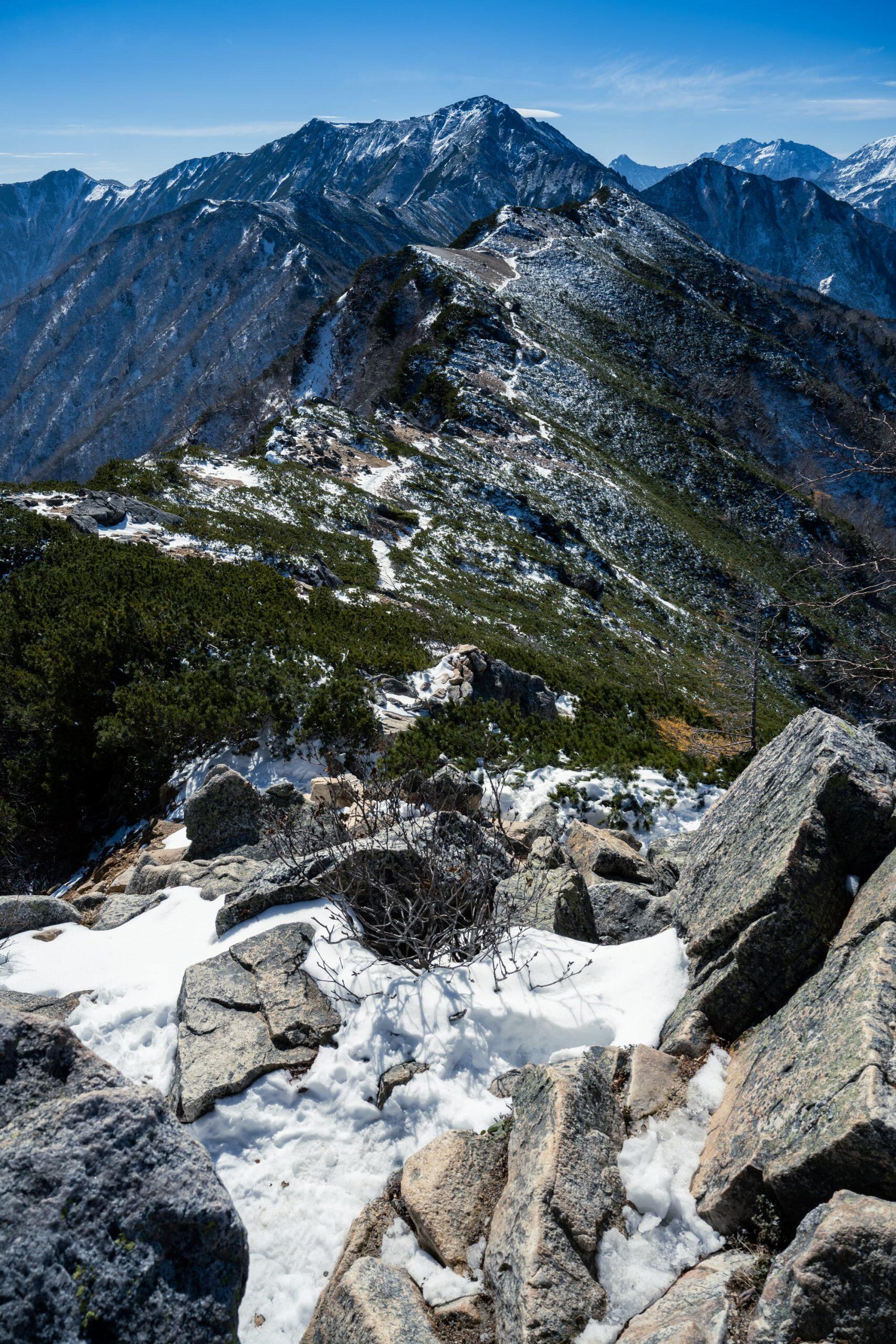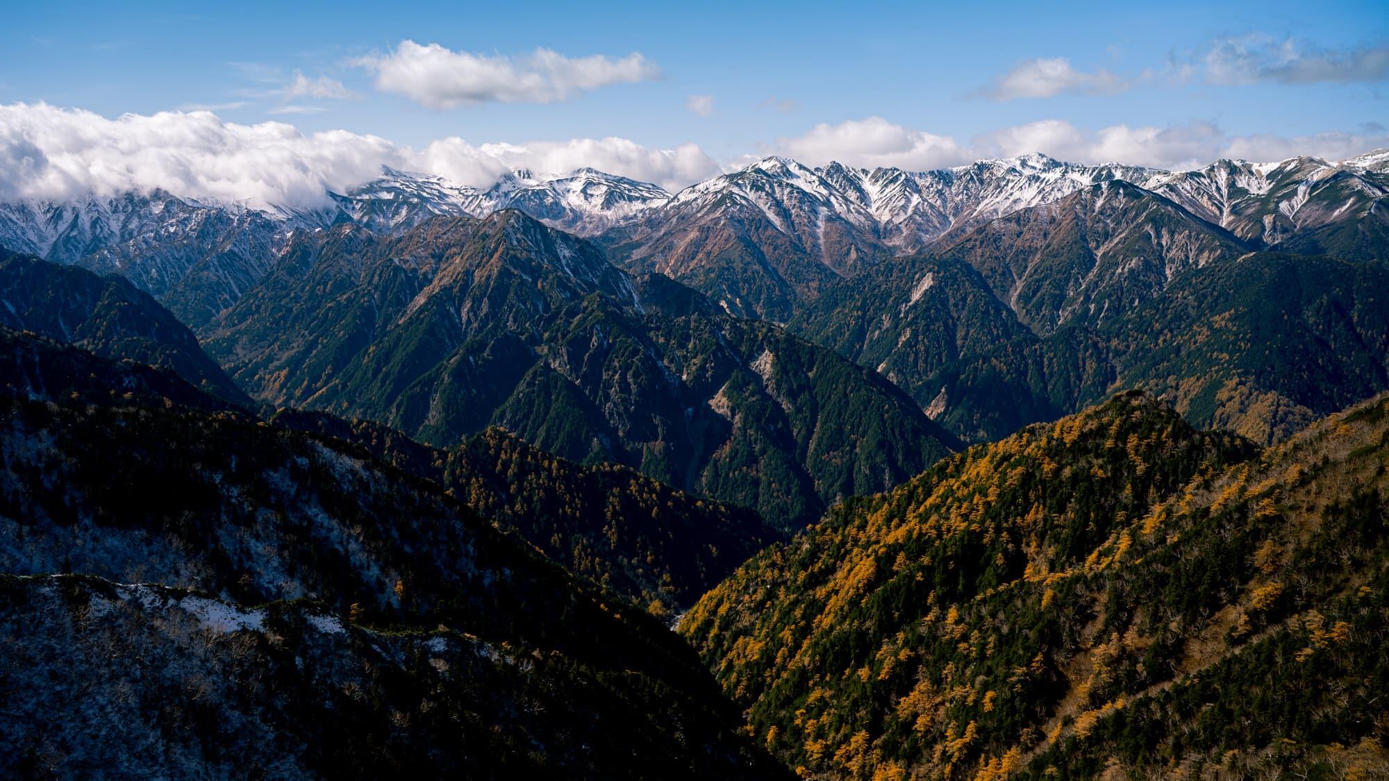 The ridge ahead of me stretched out to the north, all the way into Toyama Prefecture. Its peaks were covered by the first snow of the season, and I was treated to the rare sight of snow-capped mountains, red autumn foliage and green trees at the same time.