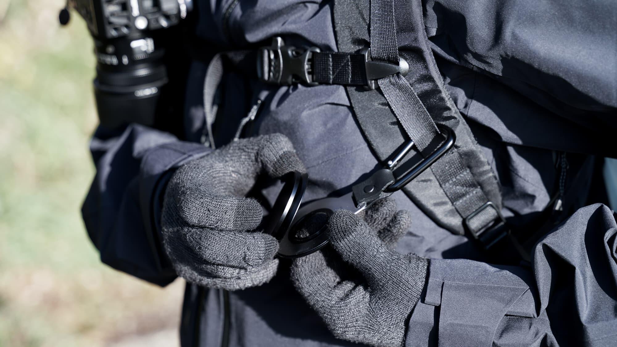 SIGMA has introduced a magnetic lens cap with the I series. To accompany this is a corresponding magnetic lens cap holder that I have placed on my left shoulder opposite the camera, making it very quick and smooth to start photographing.