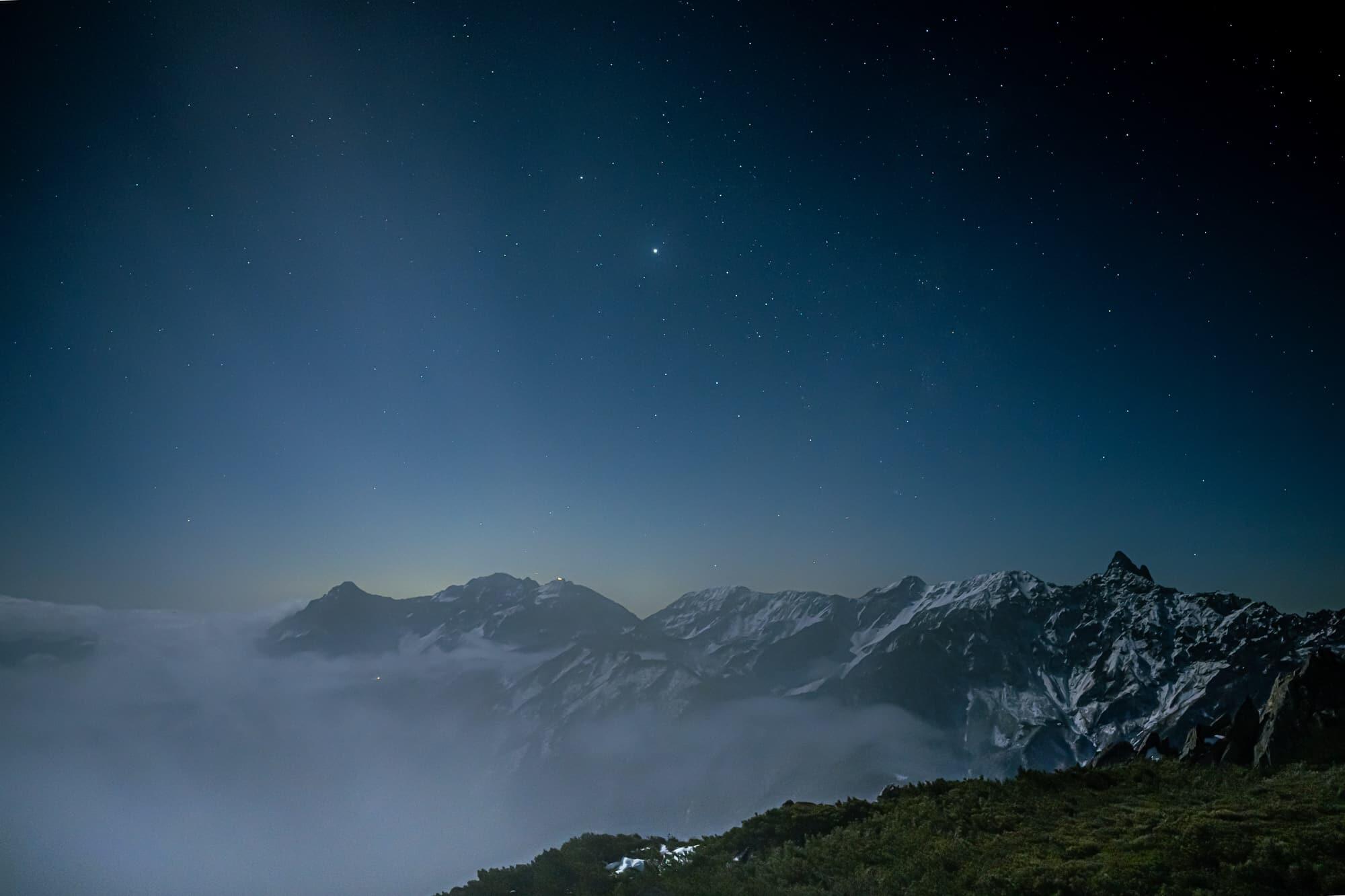 The sky was covered in a dense fog when I peeked out of my tent at 10pm. I was able to take a photograph of Mt. Yari as it stood illuminated by the moonlight.