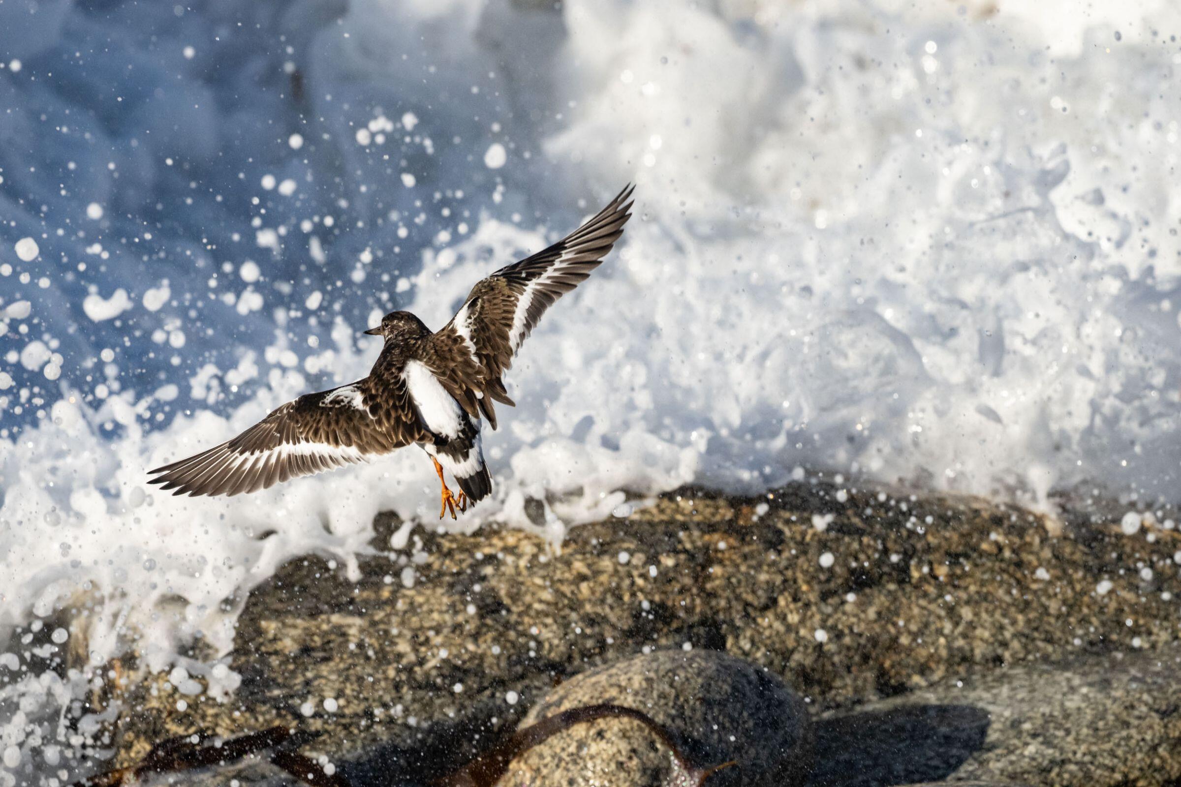 Time passes and the tide reverses. The waves then change direction and I decide to leave the point to reach a small pebble beach where the plovers like to come and play with the waves at ebb tide. I approach slowly so as not to disturb them, and keep a safe distance. I lie down on the pebbles at ground level and begin to follow their rapid movement. The lower the tide goes, the closer they get to the edge of the sea and the waves. Sometimes, they get too close and are surprised by the sudden burst of a wave. It was this moment that I had come to capture. It all happens in an instant, it's an extremely fleeting moment. The bird wanders very quickly between the pebbles, then, when the sound of the wave becomes threatening, freezes and suddenly flies away before the explosion of the wave on the rocks. It's practically impossible to anticipate in which direction the bird will fly, which makes this type of image very difficult.