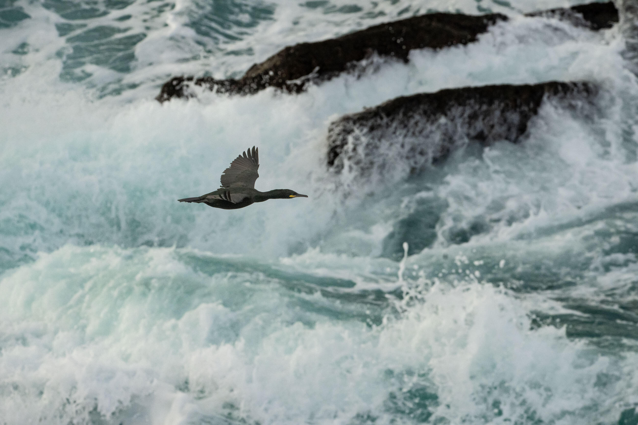 Once on the small promontory, I see that the cormorants, which spend their flight low enough to avoid the spray, often pass close to a place where the waves explode. I see one of them approaching with the right trajectory. I grab my camera, aim, and focus on the subject very quickly —the autofocus doesn't stall as I follow the bird's tricky path. For this entire series of pictures, my goal is to give as much importance to the birds as to the sea, so I must try to have a maximum depth of field in order to also freeze the details of the explosion of the wave in the background. That's why I shot most of the images in this series with apertures around F11 or even F16. This is now possible, as the sensitivity of our camera sensors has increased considerably.