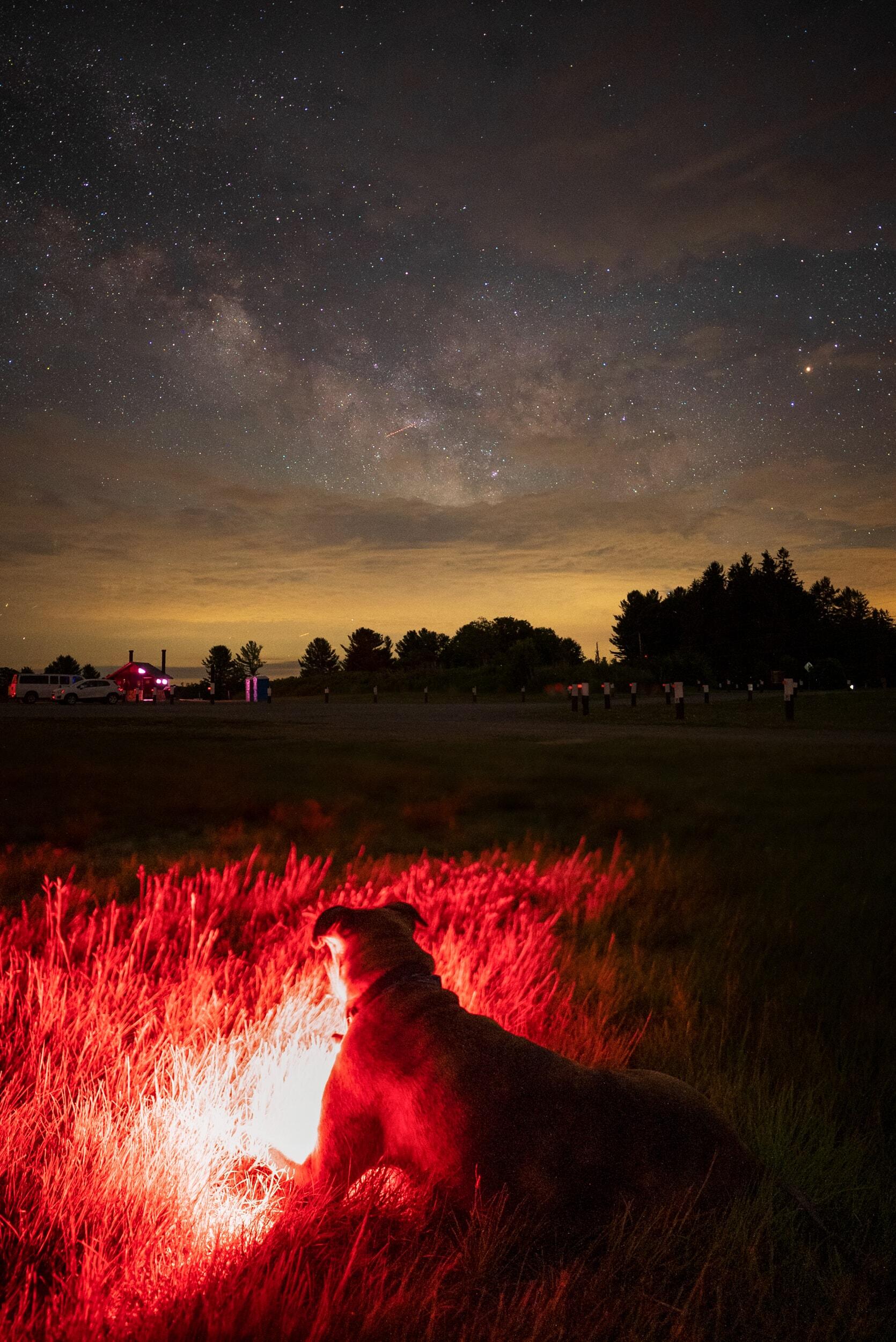I captured a few images of Kona and I hanging out while waiting for the Milky Way to move into position to help commemorate our multi-day adventure. With his own red light equipped headlamp, I was easily able to adjust focus while using the lens at F1.4 and take advantage of the live view on my mirrorless camera. I'm still amazed at how well Kona has learned to stay still for these long exposures! If you could see my catalog of images, I probably ruin more frames by moving than he does.