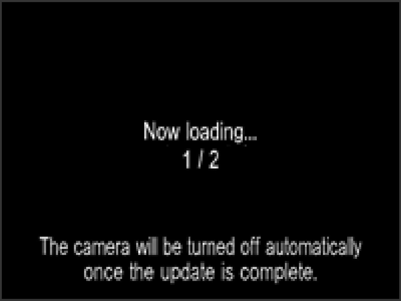 When the message “Firmware update is complete. The camera will be turned off automatically.” is displayed, the first update is complete.* Please do not operate the camera until the message “Firmware update is complete.” appears.