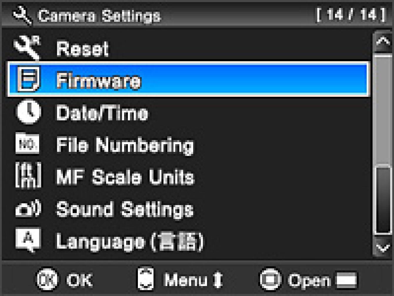 Select “Firmware” from the Camera Settings menu and press the OK button. The Firmware menu will be displayed.