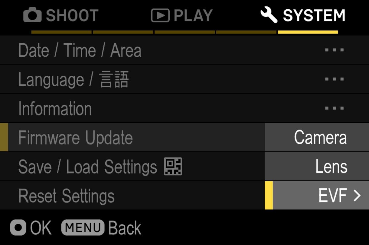 After the OK button is pressed, “Camera”, “Lens” and “EVF” shows up. Please select “EVF”.
