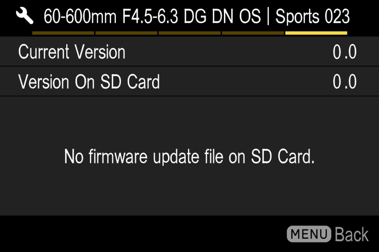 The following procedure is to update the lens firmware via SIGMA fp. For firmware updates of Leica and Panasonic L-Mount cameras, please follow the instruction manual for each camera.