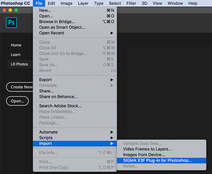 Select File⇒Import and click on X3F Plug-in for Photoshop…