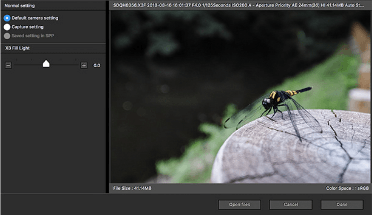 Adjustment Dialogue opens up. Select either one of Default camera setting, Capture setting or Saved setting in SPP from Normal setting, adjust X3 Fill Light and click “Open files”.